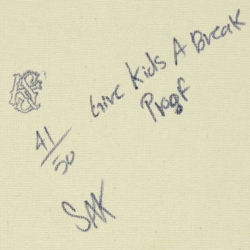 "Dollar Sign" is a limited edition hand pulled silkscreen on canvas by Andy Warhol protege Steve Kaufman (1960-2010). This piece is numbered 41/50 and hand signed inverso. Includes Certificate of authenticity. As is common with Kaufman's works, this piece may have perceived minor flaws, but is in overall good condition. Measures approx. 24" x 24" (image).