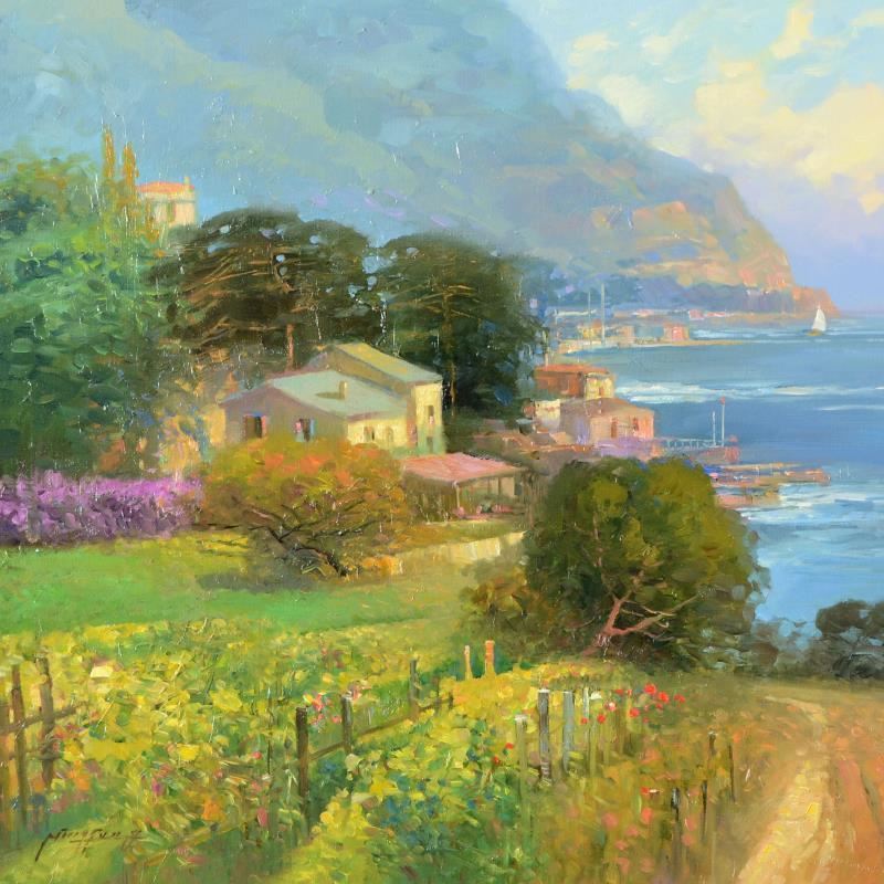 "Dolphin Bay" is an original oil painting on stretched canvas by Ming Feng, hand signed by the artist. Includes Letter of Authenticity. Measures approx. 24" x 20" (image).
