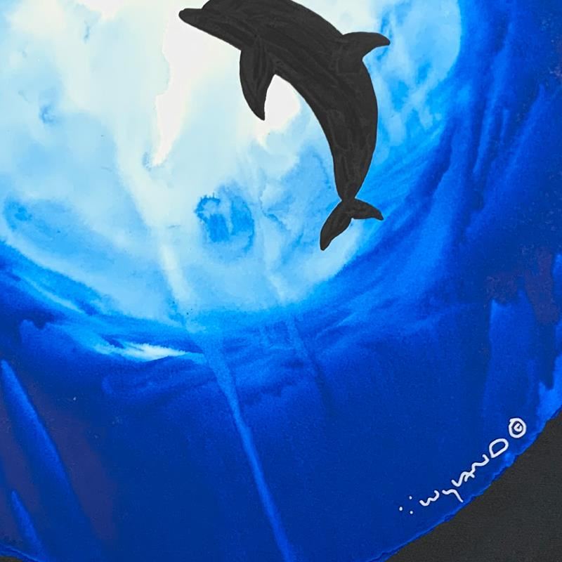 "Dolphin Flight " is an original painting, watercolor on deckle edge paper by Wyland. Hand signed by the artist, the piece comes custom framed and with a letter of authenticity. Measures approximately 30" x 30" (framed), 19.5" x 19.5" (image).