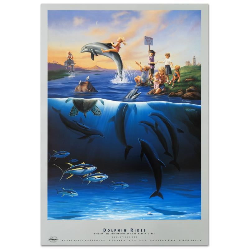 "Dolphin Rides" is a poster by Wyland. Measures approx. 18" x 26" (image).