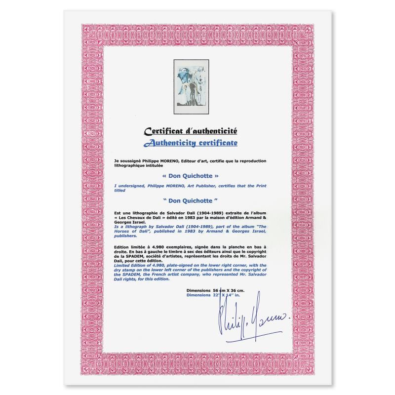 "Don Quichotte" is a limited edition lithograph by Salvador Dali (1904-1989), bearing the plate signature of the artist. This piece was published by Armand & Georges Israel in 1983 during Dali's lifetime and under his supervision. This piece was printed on Velin D'arches paper in Paris. This work is referenced in The Official Catalog of the Graphic Works of Salvador Dali (Albert Fields). This piece comes custom framed. Includes Certificate of Authenticity. Measures approx. 20" x 28" (frame), 14" x 22" (image).