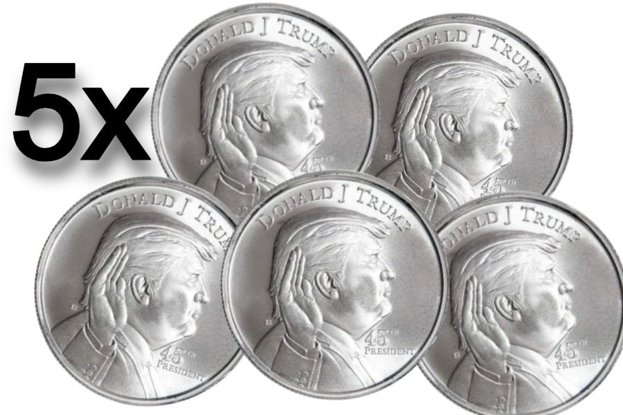 This bundle features five 1oz .999 fine silver coins showcasing a detailed profile of the 45th President, Donald J. Trump. Perfect for collectors and political memorabilia enthusiasts, these coins make a great gift or investment. With the intrinsic value of fine silver, this set is an ideal way to celebrate American history and presidential legacy.