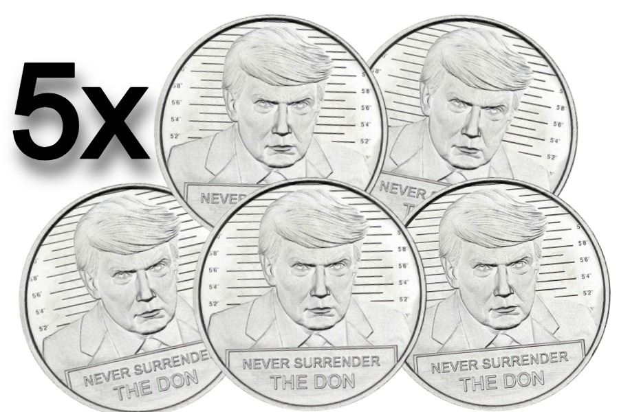 This set includes five 1oz .999 fine silver coins, each depicting the bold "Never Surrender" mugshot of Donald Trump. A unique and collectible piece of political history, this bundle is a standout gift for Trump supporters and silver investors. The design captures a moment of defiance, making it a valuable addition to any collection.
