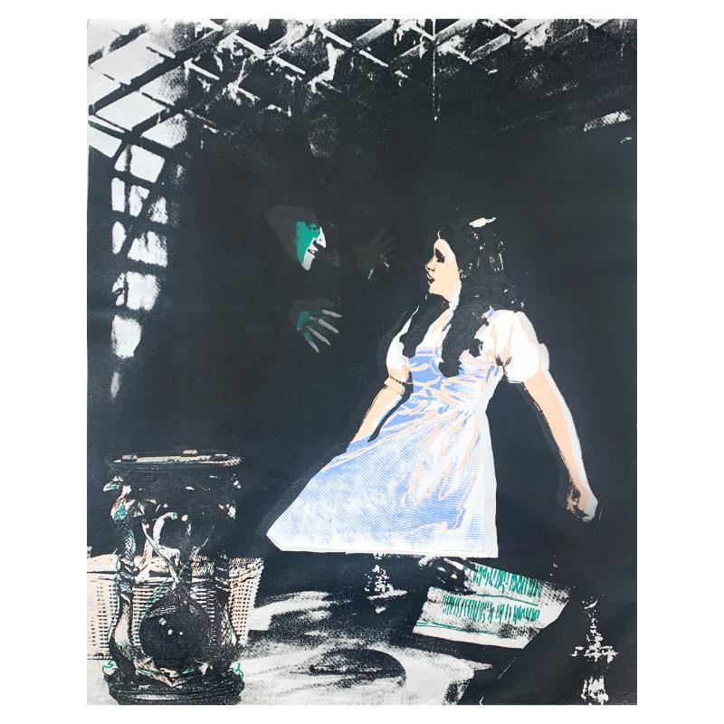 Dorothy and the Wicked Witch by Steve Kaufman (1960-2010). All available information is listed in the description and shown in the photo. "Dorothy and the Wicked Witch" is a limited edition hand pulled silkscreen unique mixed media on canvas by Andy Warhol protege Steve Kaufman (1960-2010). This piece is numbered and hand signed inverso and includes a letter of authenticity. As is common with Kaufman's works, this piece may have perceived minor flaws, but is in overall good condition. Measures approximately 35" x 27.5" before cropping.