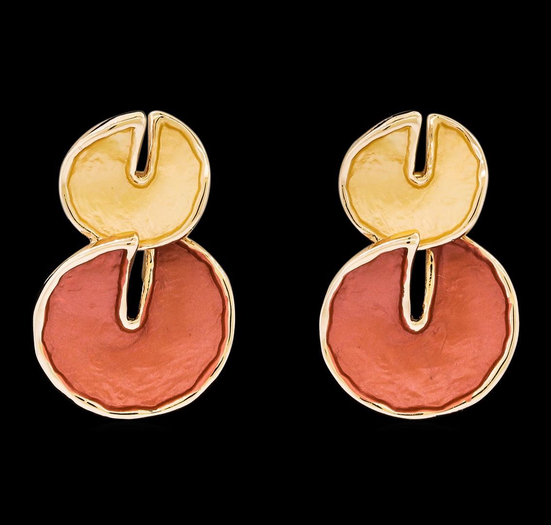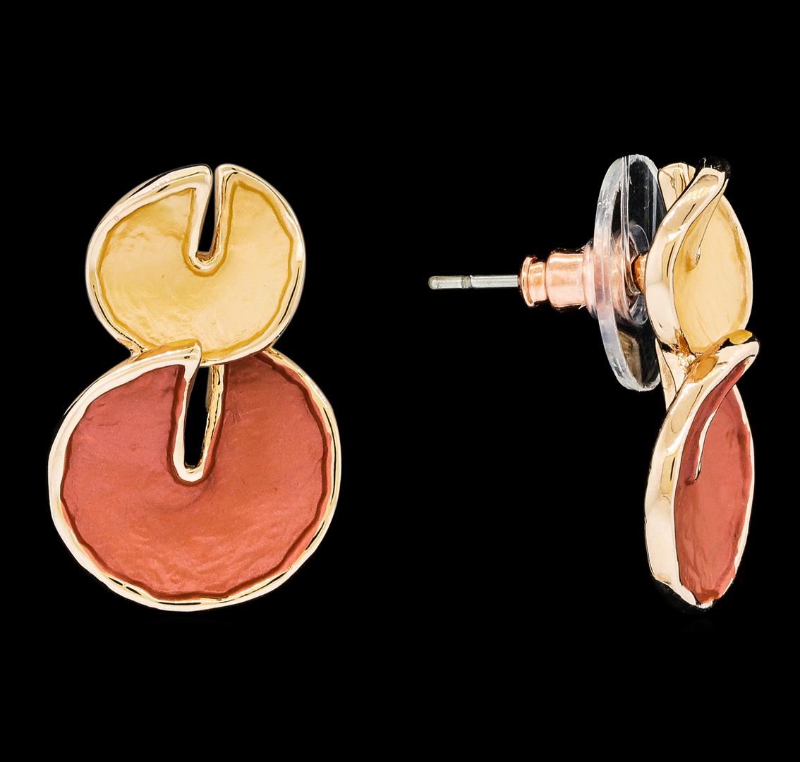 High end designer jewelry. Double Circle Dangle Earrings - Rose Gold Plated. Rose Gold Plated Post Set. Brown/ Nude/ Rose. 1inch. Total Weight: 4.7 grams.