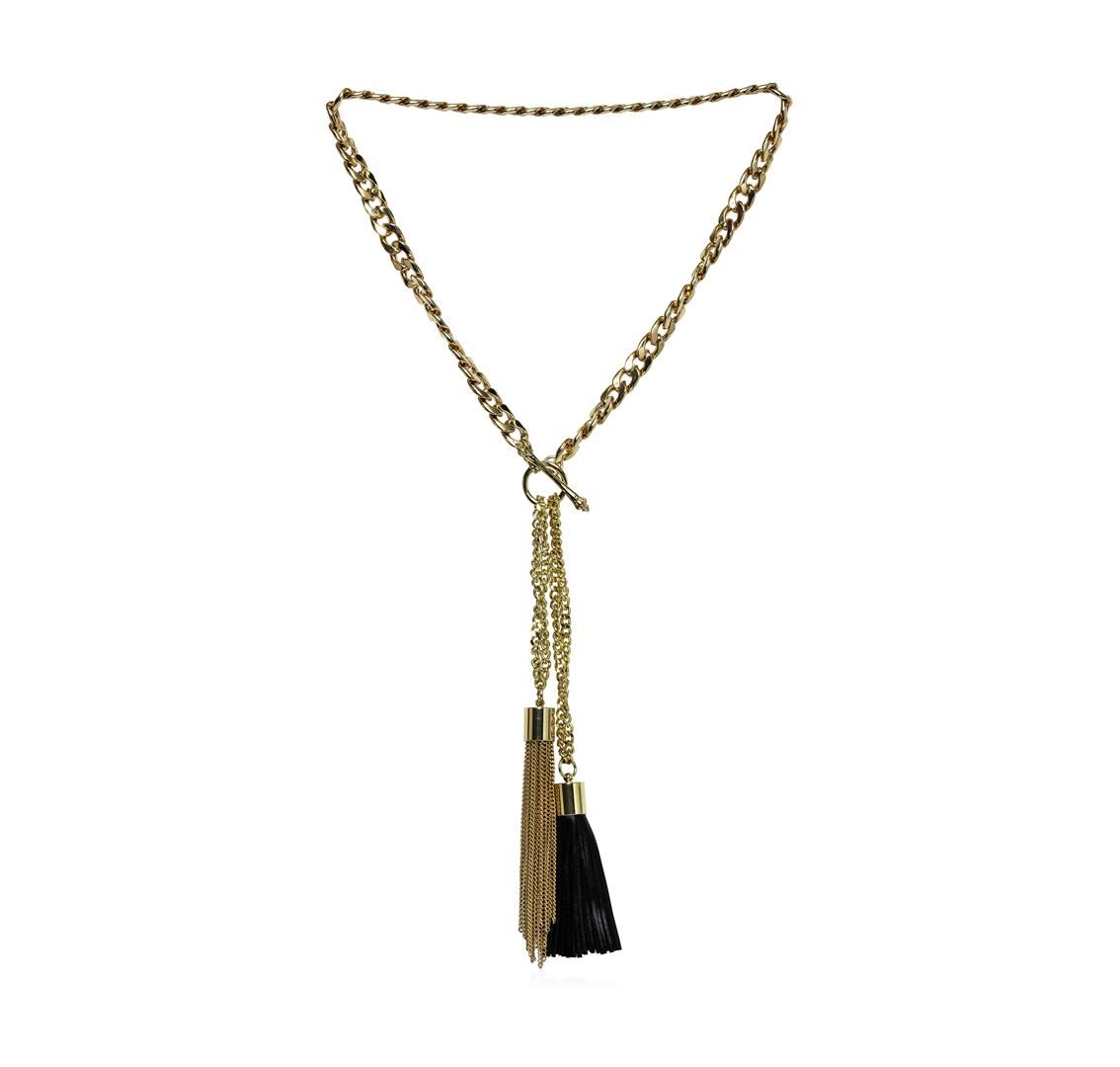 High end designer jewelry. Double Leather Tassel Chain Necklace - Gold Plated. Gold Plated Metal/3" Ext Clasp. Black/ Gold. 28/6.5inches. Total Weight: 120.5 grams.