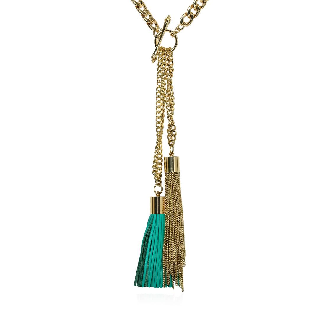 High end designer jewelry. Double Leather Tassel Chain Necklace - Gold Plated. Gold Plated Metal/3" Ext Clasp. Aqua/ Gold. 28/6.5inches. Total Weight: 119.4 grams.