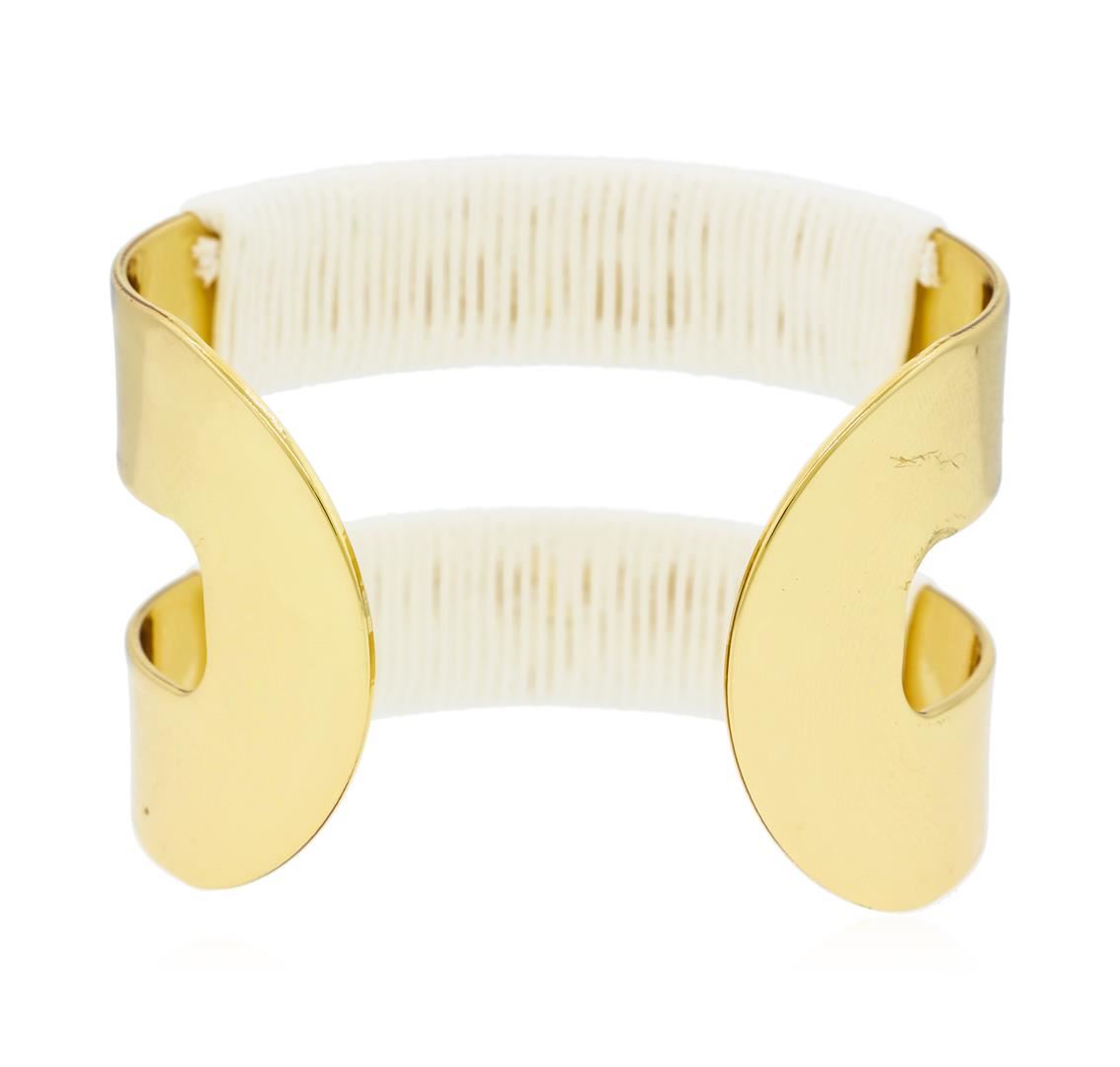 High end designer jewelry. Double Metal Strand Leather Cuff Bracelet - Gold Plated. Gold Plated Metal. White/gold. Adjustable. Total Weight: 47 grams.