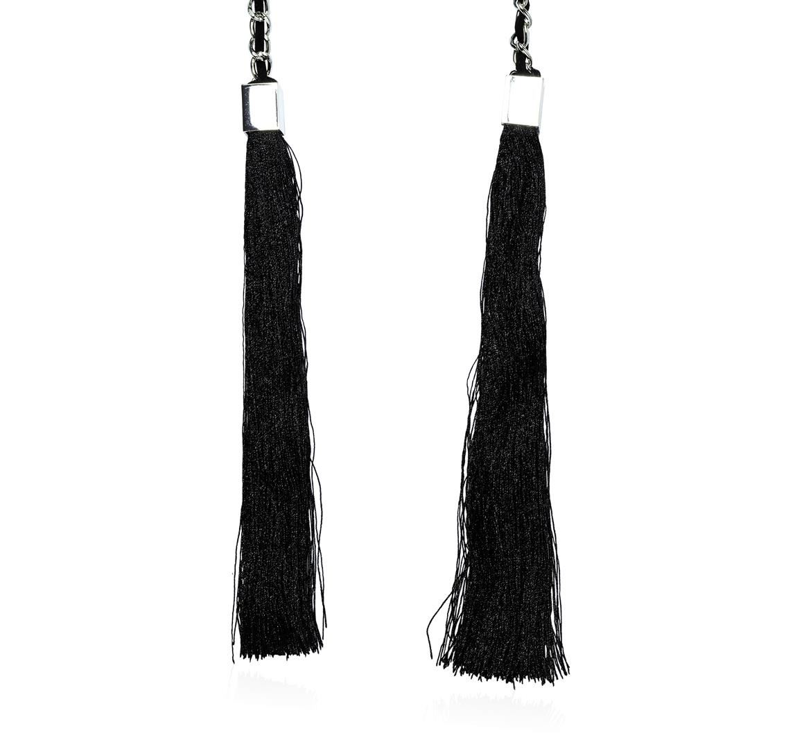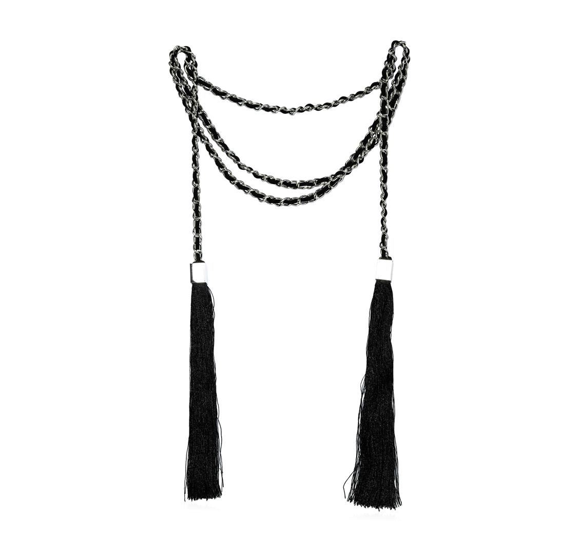 High end designer jewelry. Double Silk Tassel Braided Necklace - Rhodium Plated. Rhodium Plated Metal/ Suede. Black/ Silver. 46/7.5inches. Total Weight: 97.7 grams.