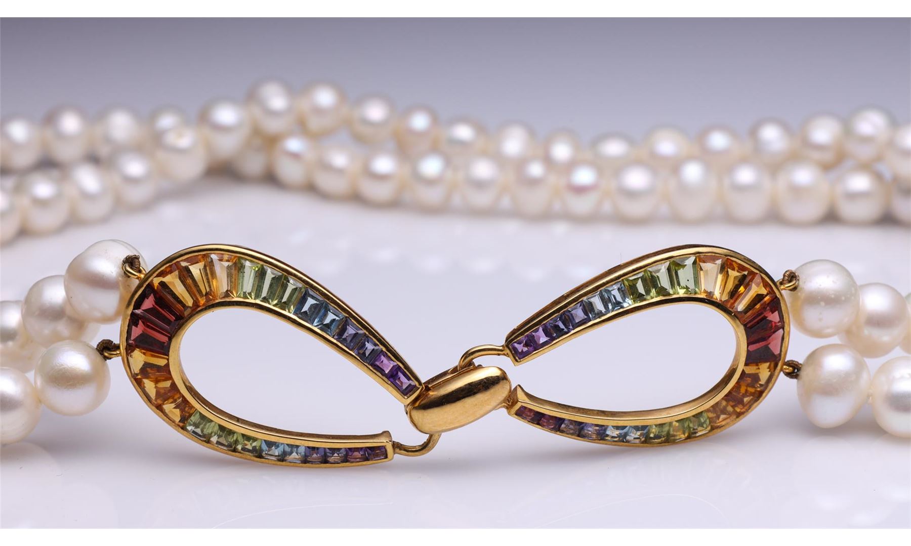 Double Strand Pearl Necklace With 14K Yellow Gold & Graduated Multi Color Gemstone Clasp. Total weight of 85.2 gm. Estimated retail value $4,500.