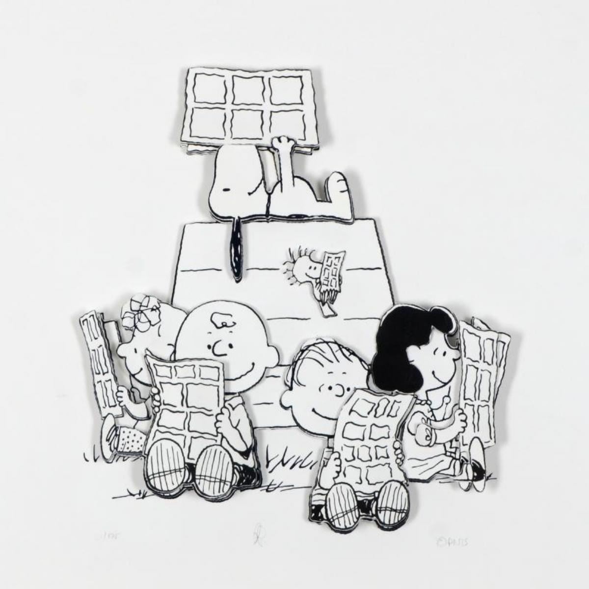 Down Time by Peanuts. Created from the original artwork archived at the studio, "Down Time" portrays the simple yet emotive art of Charles. M. Schulz, creator of PEANUTS. This 3D decoupage print on paper is hand numbered with Certificate of Authenticity. Measures approx. 15.5" x 15.5" (shadow box), 5" x 5" (image).