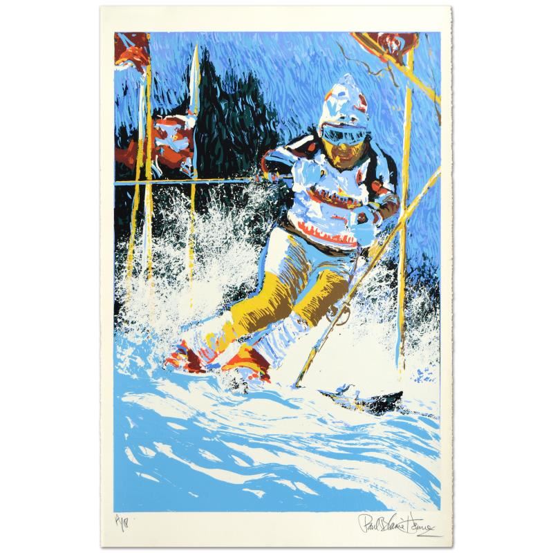 "Downhill Skier" is a limited edition serigraph on deckle-edge paper, hand signed by Paul Blaine Henrie (1932-1999)! Includes Certificate of Authenticity! Measures approx. 26" x 40" (border), 24" x 35.5" (image).