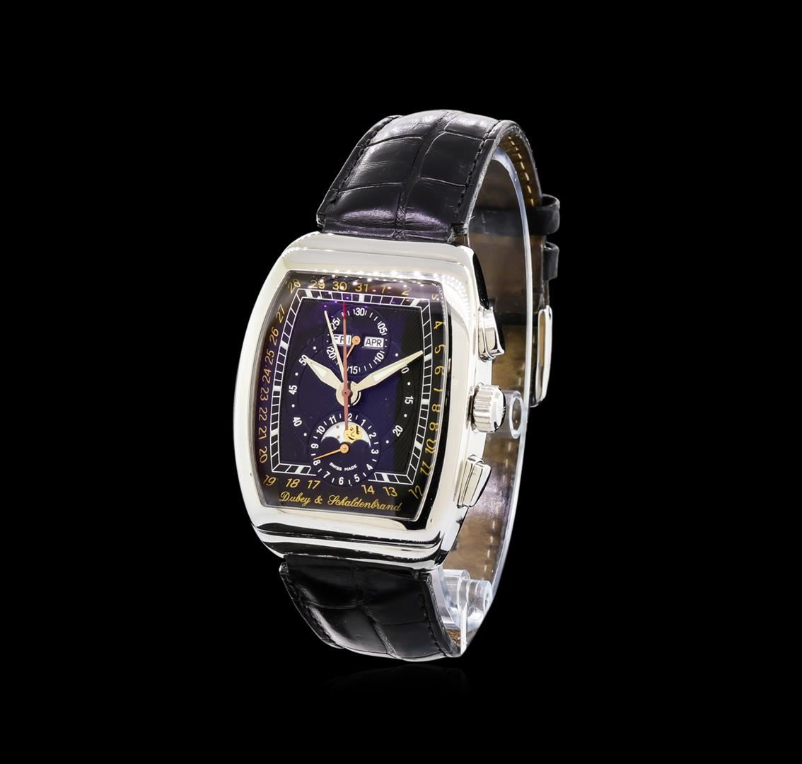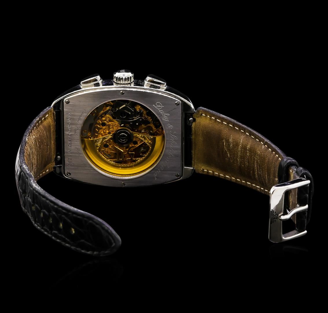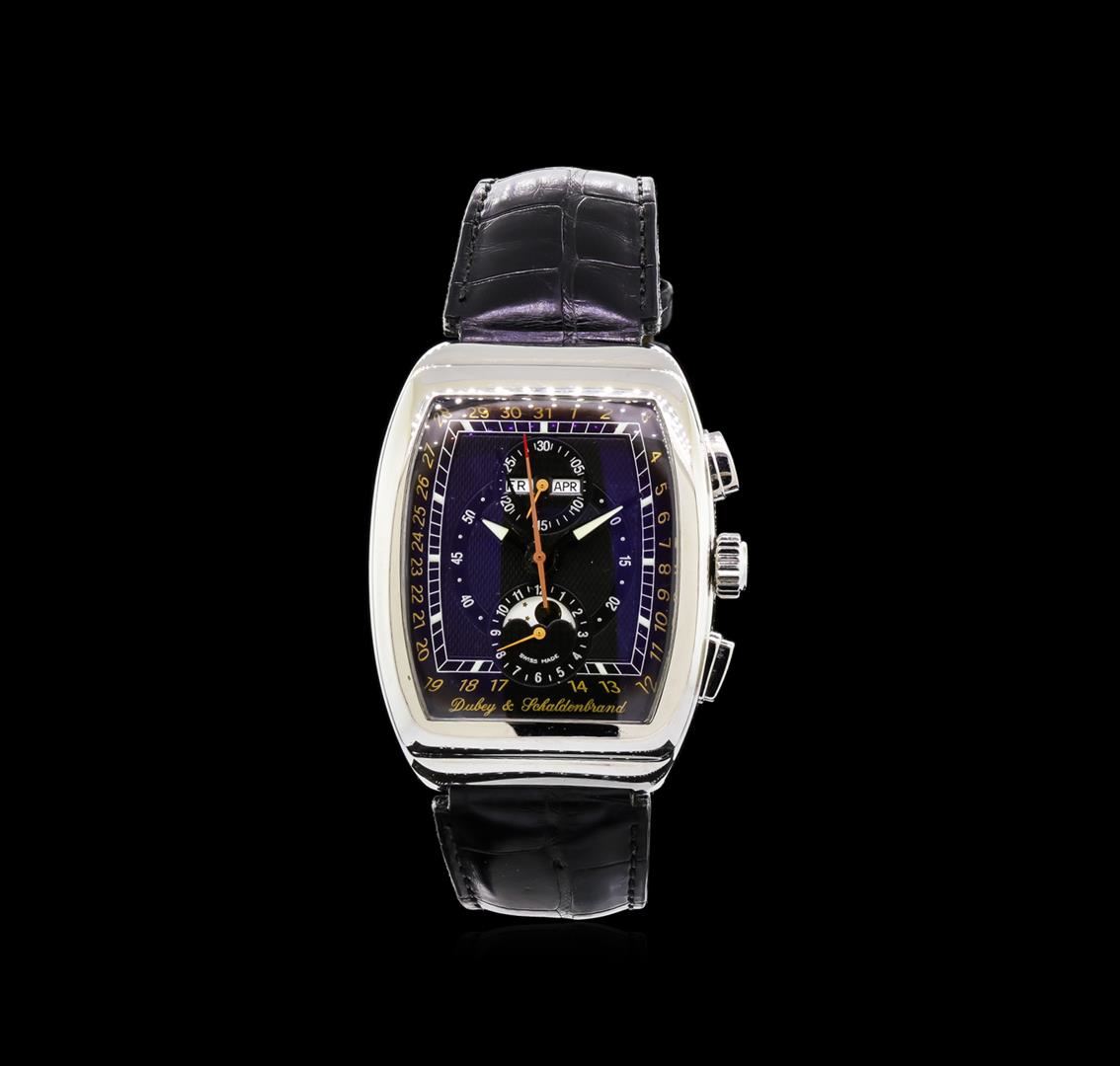 One, Dubey & Schaldenbrand Gran Chrono Astro Moon Phase wristwatch, electronically tested stainless steel, Case: 50mm x 38mm, Synthetic Sapphire Exhibition Case Back: secured by six set screws, engraved with the manufacturers name, model name, and ID numbers, Crown: logo'd, set between the Chronograph pushers, Bezel: fixed & polished, Crystal: domed anti-reflective synthetic sapphire crystal, Movement: Swiss automatic. Dial: Black, with luminous hands, and indices, Chronograph Functions: two sub dials for; Moon Phase and Hours at the six o'clock position, Minutes, and the Day/Month at the 12 o'clock position, the dial is framed by the seconds hand markers, Bracelet: saddle stitched alligator strap, nine inch length adjustable. Dubey & Schaldenbrand stainless steel buckle. Condition: G-6 Extra Fine. Total Weight of Watch 105.36gm. AIG Appraised at $4,550.00.