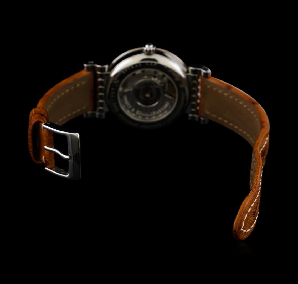 One, Dubey & Schaldenbrand Spiral Cap wristwatch, electronically tested stainless steel, Case: 36mm in diameter, Synthetic Sapphire Exhibition Case Back: the frame is engraved with the manufacturers name, model name, and ID numbers, Crown: nine o'clock position, scalloped, set with a Blue color cabochon, Bezel: fixed & polished, Crystal: domed anti-reflective synthetic sapphire crystal, Dubey & Schaldenbrand Movement: automatic. Dubey & Schaldenbrand signed Dial: Ivory color, textured, with pointed hands, numerals, and indices, Date Window: six o'clock position, Power Reserve Indicator: twelve o'clock position, the dial is framed by the seconds hand markers, Dubey & Schaldenbrand Bracelet: saddle stitched leather strap, eight inch length adjustable. Dubey & Schaldenbrand stainless steel buckle. Condition: G-6 Extra Fine. Total Weight of Watch 60.36gm. AIG Appraised at $5,050.00.