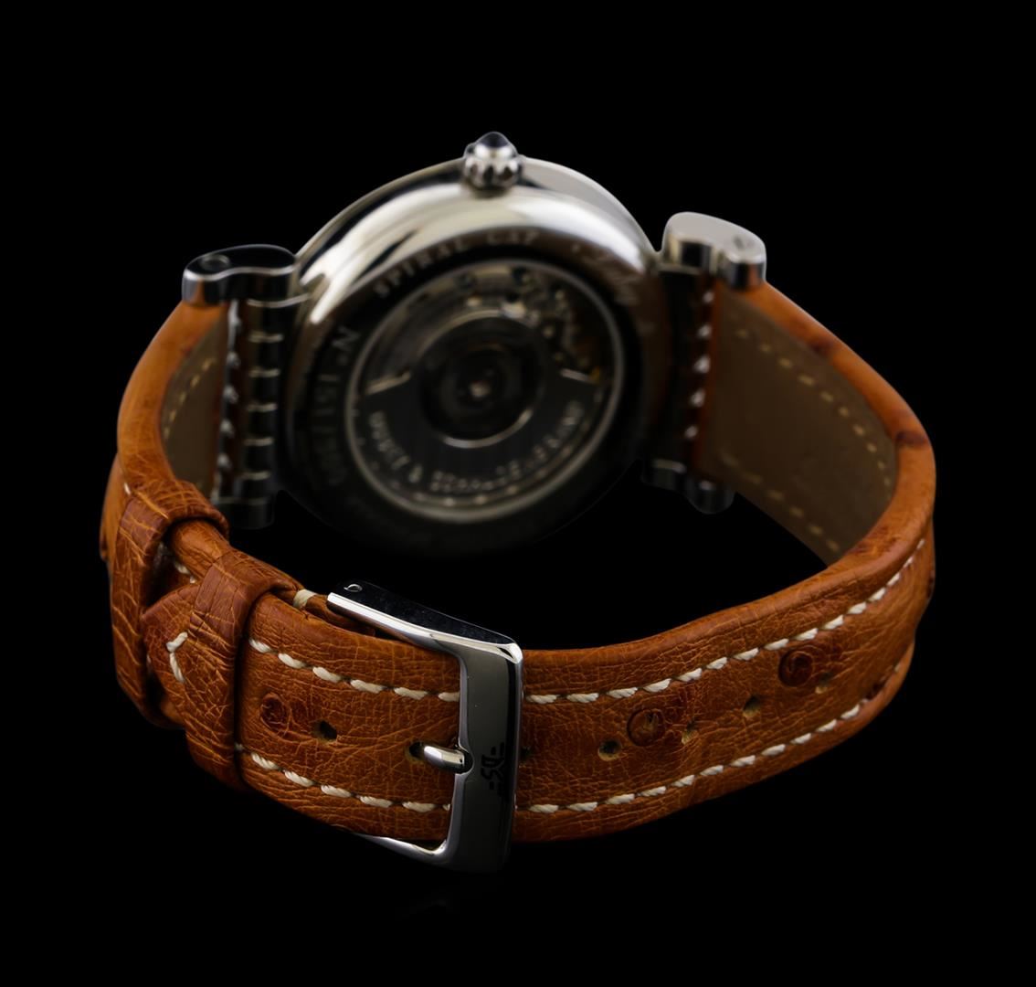 One, Dubey & Schaldenbrand Spiral Cap wristwatch, electronically tested stainless steel, Case: 36mm in diameter, Synthetic Sapphire Exhibition Case Back: the frame is engraved with the manufacturers name, model name, and ID numbers, Crown: nine o'clock position, scalloped, set with a Blue color cabochon, Bezel: fixed & polished, Crystal: domed anti-reflective synthetic sapphire crystal, Dubey & Schaldenbrand Movement: automatic. Dubey & Schaldenbrand signed Dial: Ivory color, textured, with pointed hands, numerals, and indices, Date Window: six o'clock position, Power Reserve Indicator: twelve o'clock position, the dial is framed by the seconds hand markers, Dubey & Schaldenbrand Bracelet: saddle stitched leather strap, eight inch length adjustable. Dubey & Schaldenbrand stainless steel buckle. Condition: G-6 Extra Fine. Total Weight of Watch 60.36gm. AIG Appraised at $5,050.00.