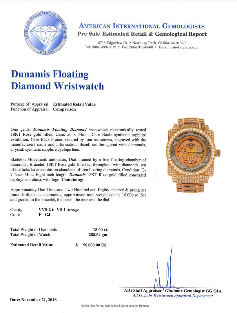 One gents, Dunamis Floating Diamond wristwatch electronically tested 18KT Rose gold filled, Case: 56 x 44mm, Case Back: synthetic sapphire exhibition, Case Back Frame: secured by four set screws, engraved with the manufacturers name and information, Bezel: set throughout with diamonds, Crystal: synthetic sapphire cyclops lens. Skeleton Movement: automatic, Dial: framed by a free floating chamber of diamonds, Bracelet: 18KT Rose gold filled set throughout with diamonds, ten of the links have exhibition chambers of free floating diamonds, Condition: G-7 Near Mint. Eight inch length. Dunamis 18KT Rose gold filled concealed deployment clasp, with logo. Containing: Approximately One Thousand Two Hundred and Eighty channel & prong set round brilliant cut diamonds, approximate total weight equals 18.00ctw. Set and graded in the bracelet, the bezel, the case and the dial. Clarity: VVS-2 to VS-1 Average Color F - GJ. Total Weight of Diamonds 18.00ct. Total Weight of Watch 288.64gm. AIG Appraised at $56,000.00.