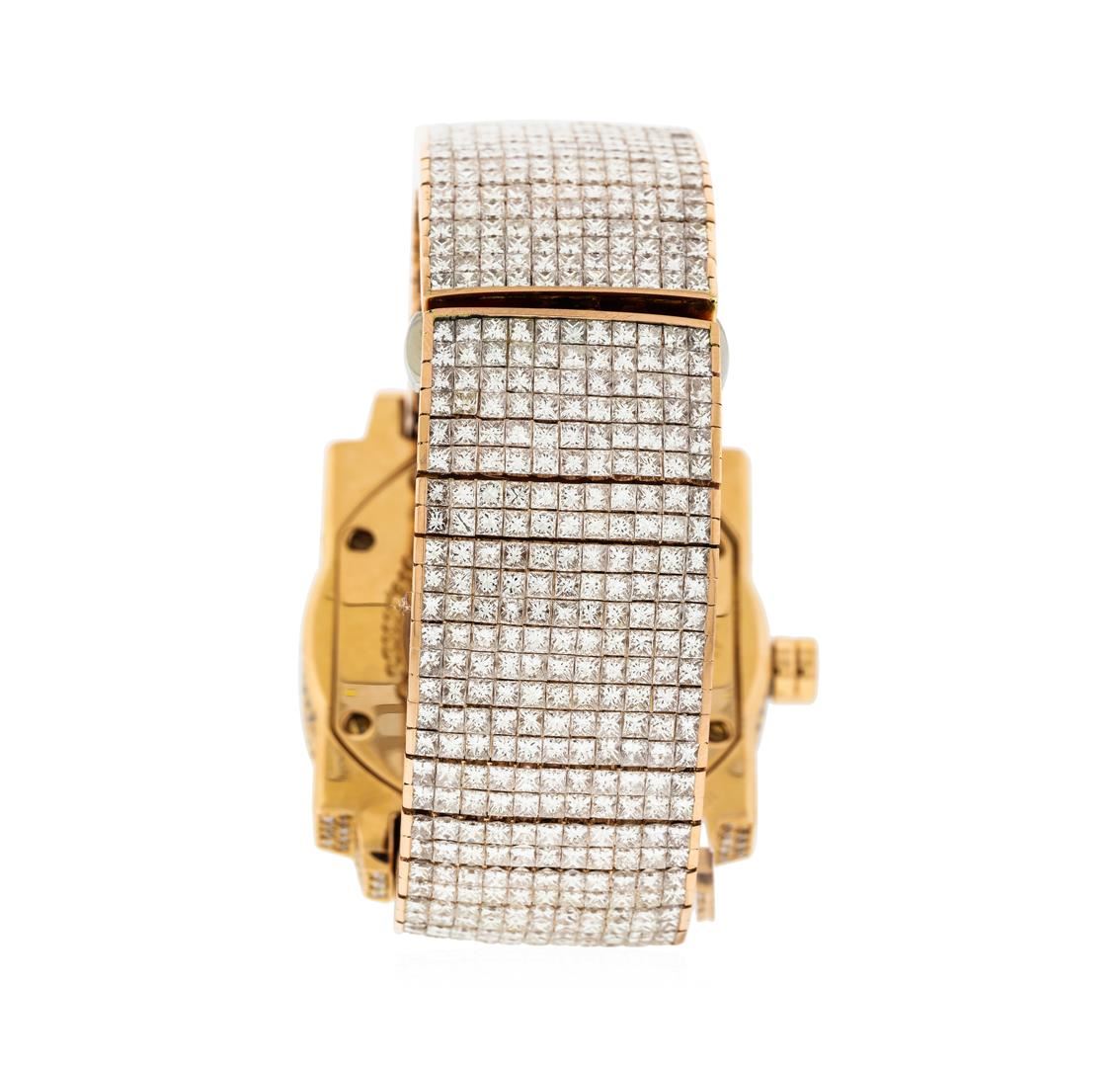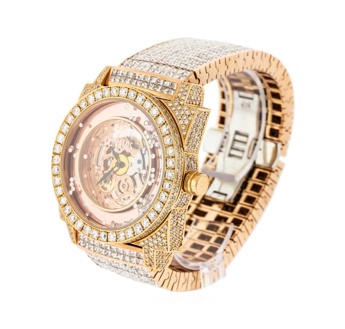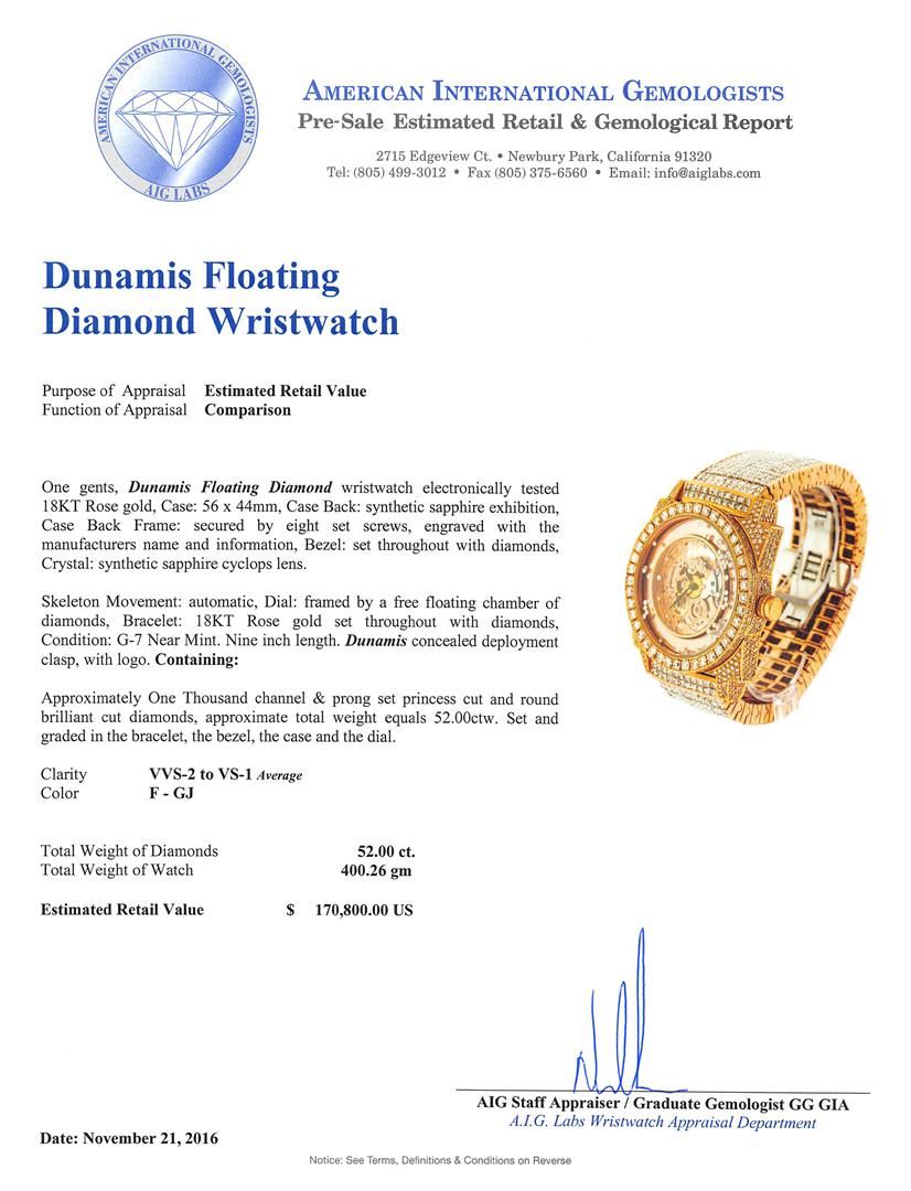 One gents, Dunamis Floating Diamond wristwatch electronically tested 18KT Rose gold, Case: 56 x 44mm, Case Back: synthetic sapphire exhibition, Case Back Frame: secured by eight set screws, engraved with the manufacturers name and information, Bezel: set throughout with diamonds, Crystal: synthetic sapphire cyclops lens. Skeleton Movement: automatic, Dial: framed by a free floating chamber of diamonds, Bracelet: 18KT Rose gold set throughout with diamonds, Condition: G-7 Near Mint. Nine inch length. Dunamis concealed deployment clasp, with logo. Containing: Approximately One Thousand channel & prong set princess cut and round brilliant cut diamonds, approximate total weight equals 52.00ctw. Set and graded in the bracelet, the bezel, the case and the dial. Clarity: VVS-2 to VS-1 Average Color F - GJ. Total Weight of Diamonds 52.00ct. Total Weight of Watch 400.26gm. AIG Appraised at $170,800.00.