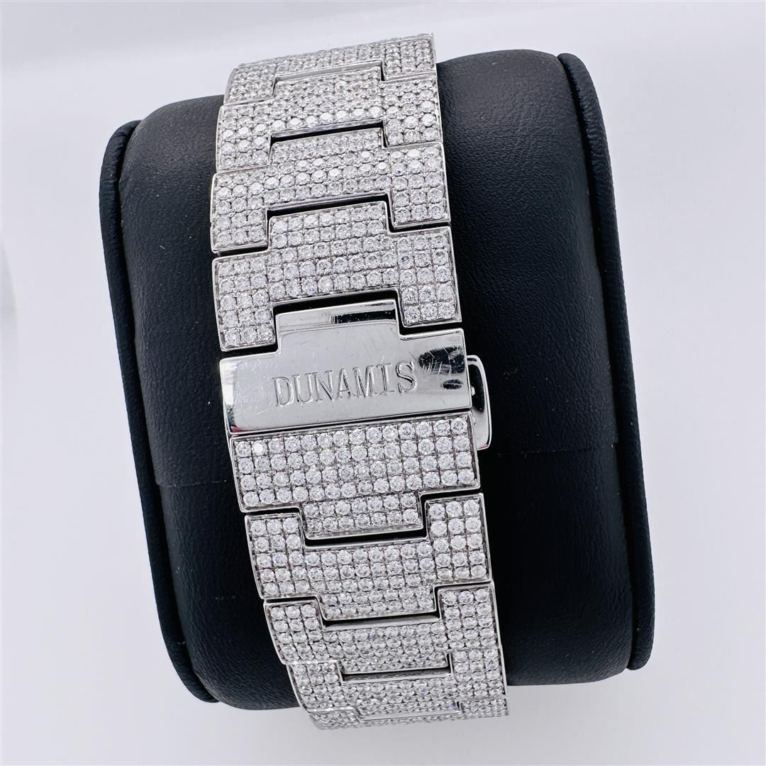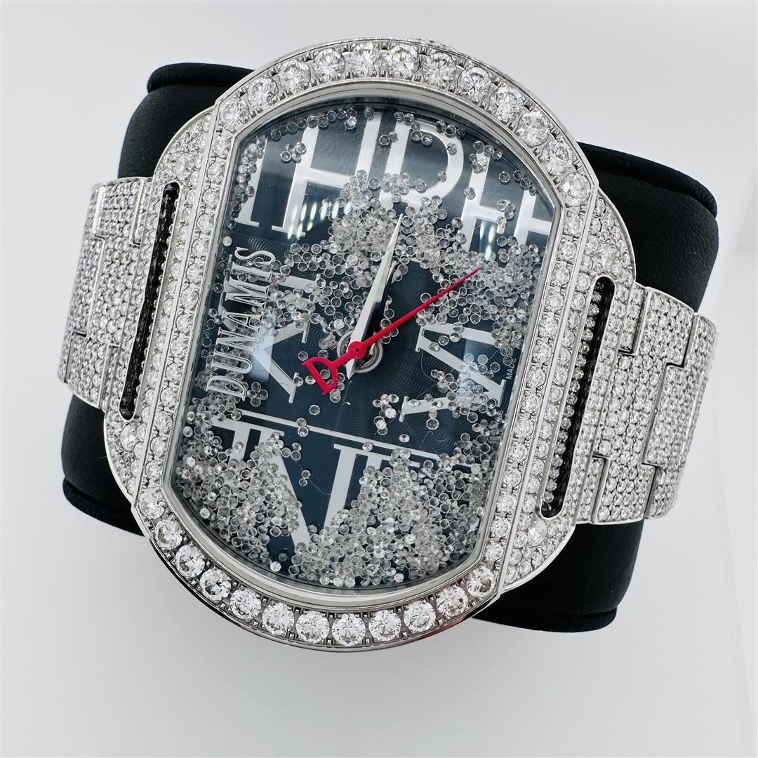 DUNAMIS Stainless Steel Wrist Watch. With Floating Diamonds in the Dial. With Diamond encrusted Bezel. With Diamond encrusted Head and Sides. With Diamond encrusted Strap. With See through back to Movement. With 2744 Round Brilliant Diamonds Approximately 20.70 cts. Serial: D1171 Model: Hercules Case: 50 millimeters Crown: Twin Lock Screw Down Bezel: Stainless Steel Diamonds Crystal: Sapphire Hands: Narrow Baton Pointed, with Red Logo Second Hand Movement: Automatic Dial: Black/Logo Bracelet: Stainless Steel, Diamond Clasp: Double Deployment Weight: 185.30 grams... We've been told that similar items without diamonds on the band, have been found online for up to $38K!