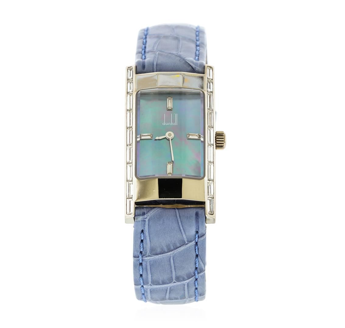 One, Dunhill wristwatch electronically tested 18KT White gold, Case: 33 x 18mm, Swiss Hallmarked Water Resistant: 30 meters / 100 feet, Case Back, secured by four set screws, engraved with the manufacturers name, and information, Crown: scalloped, Bezel: diamond set, Crystal: beveled synthetic sapphire lens, Movement: quartz. Dunhill signed Dial: dark mother of pearl, with pointed hands, and four raised diamond markers, Chopard Bracelet: Light Blue saddle stitched leather strap, Condition: G-5 Fine. Seven inch length, adjustable. Swiss Hallmarked Van Cleef & Arpels White gold filled buckle. Containing: Eighteen channel set baguette cut diamonds, measuring from 3.40 x 1.50 x 1.05mm (depth est.) to 3.90 x 1.50 x 1.05mm (depth est.) approximate total weight of 18 Stones = 0.95ct. Clarity: VVS-1 to VS-1 Color F - G Four prong set baguette cut diamonds, measuring 2.40 x 1.20 x 0.84mm (depth est.) approximate total weight of 4 Stones = 0.08ct. Graded in the setting. Clarity: VVS-2 to VS-1 Color F - G. Total Weight of Diamonds 1.03ct. Total Weight of Watch 39.59gm. AIG Appraised at $12,000.00.