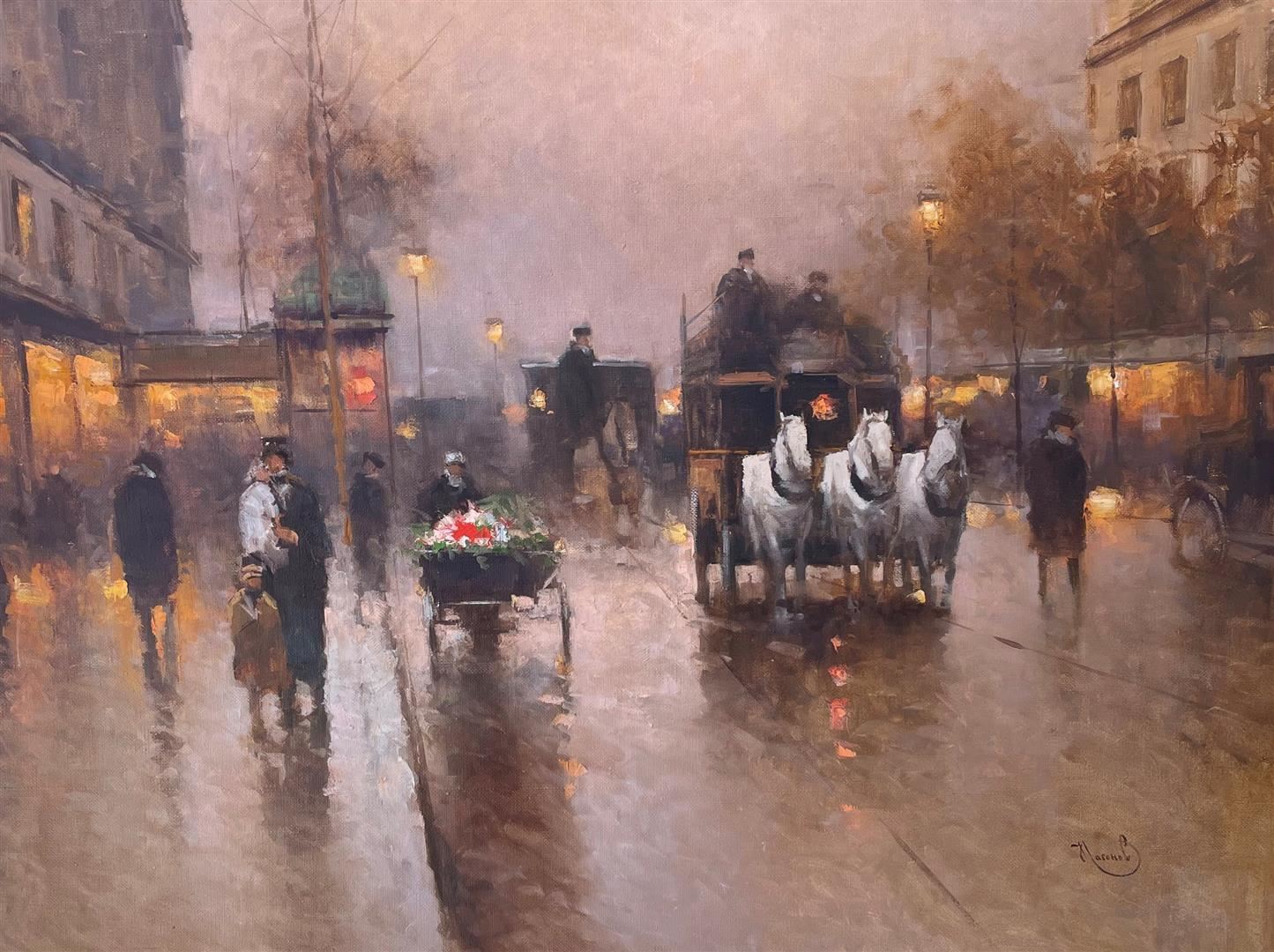 Russian artist, Vladimir Nasonov, depicts a busy, turn-of-the-century street scene, with a horse-drawn carriage, flower cart and people hurriedly walking to their destination before the sun goes down in this oil on canvas. The painting measures 29 x 39; framed image measures 41 x 51.