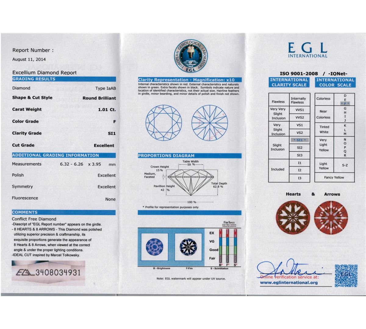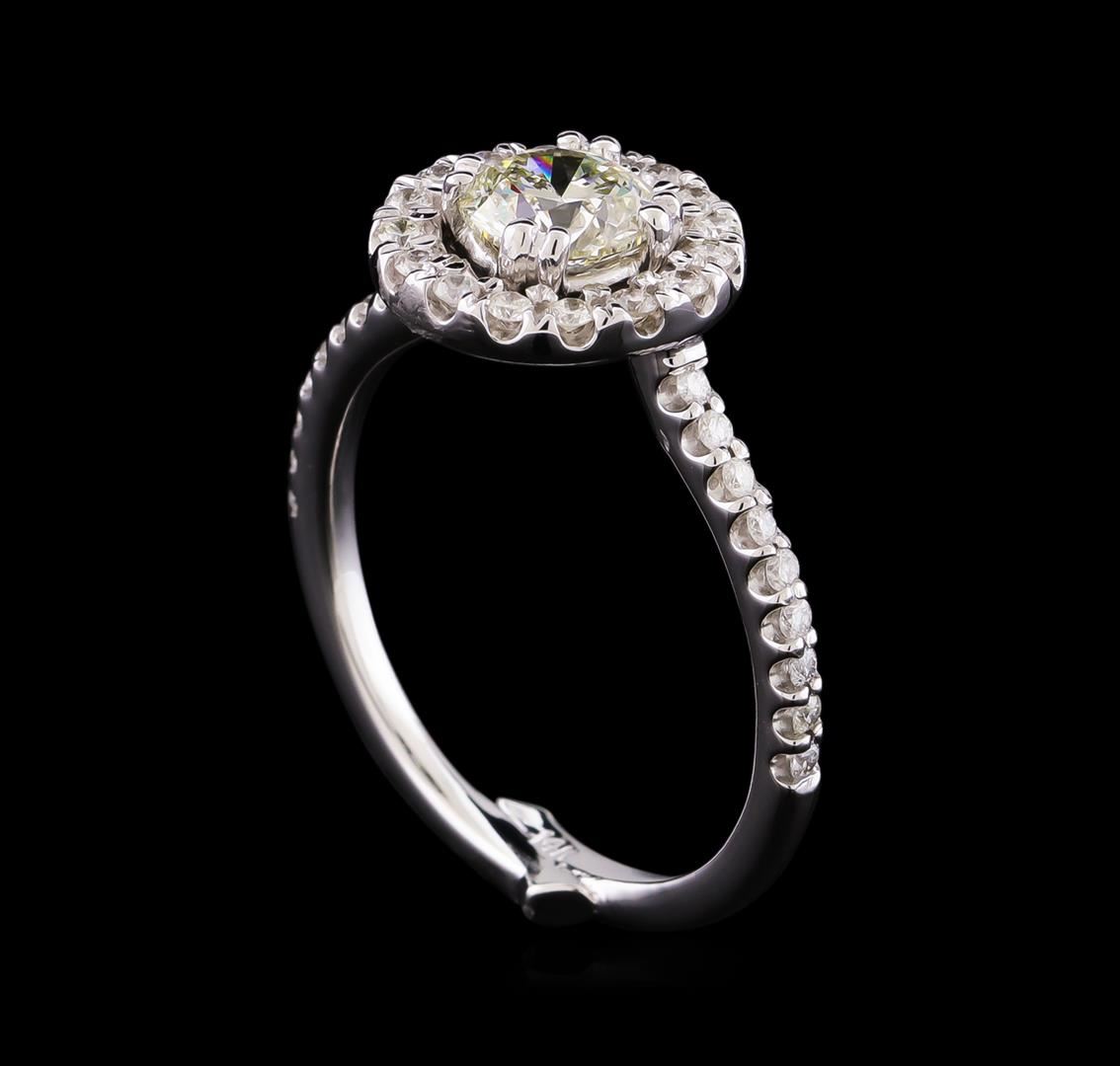 One electronically tested 14KT white gold lady's cast wedding ring with a halo with a bright polish finish. The featured lady's ring has a partially overlapping shank measuring 2.93 millimeters wide. Identified with markings of "14K". Condition is new, good workmanship. Containing: One prong set round brilliant cut diamond, measuring 6.32 - 6.26 x 3.95mm (depth est.) , 5.00.%. GTCF approximate weight of 1.01ct. Graded loose prior to setting in the EGL Laboratory Report #EGL3408034931. Clarity: SI-1. Color: Ideal Sixteen prong set round brilliant cut diamonds, measuring 1.60 - 1.50 x 0.96mm (depth est.) approximate total weight of 16 Stones = 0.24ct. Graded in the setting. Clarity: SI-1 to I-1. Color: G - Good Eighteen prong set round brilliant cut diamonds, measuring 1.40 - 1.30 x 0.84mm (depth est.) approximate total weight of 18 Stones = 0.18ct. Graded in the setting. Clarity: SI-2 to I-1. Color: G - Good. Total Weight of Diamonds 1.43ct. Total Weight of Ring 4.60gm. GAS Appraised at $16,045.00.