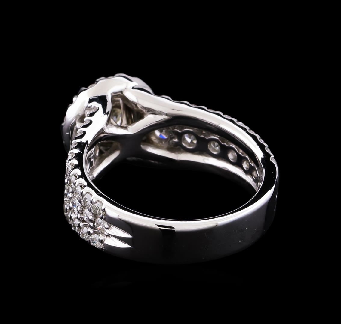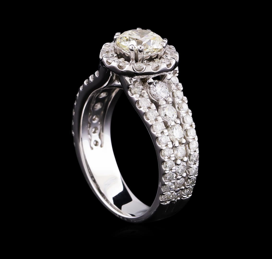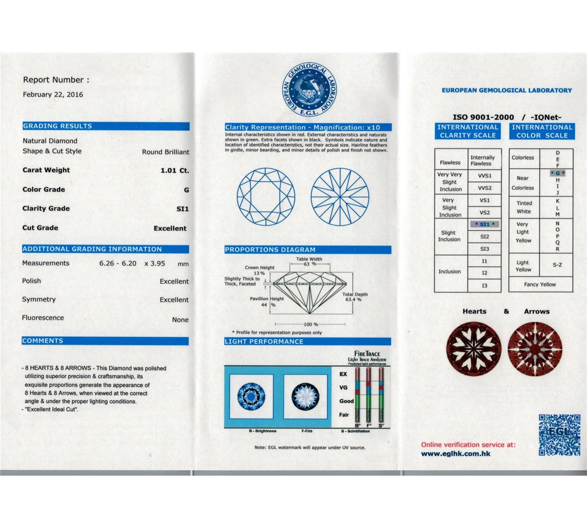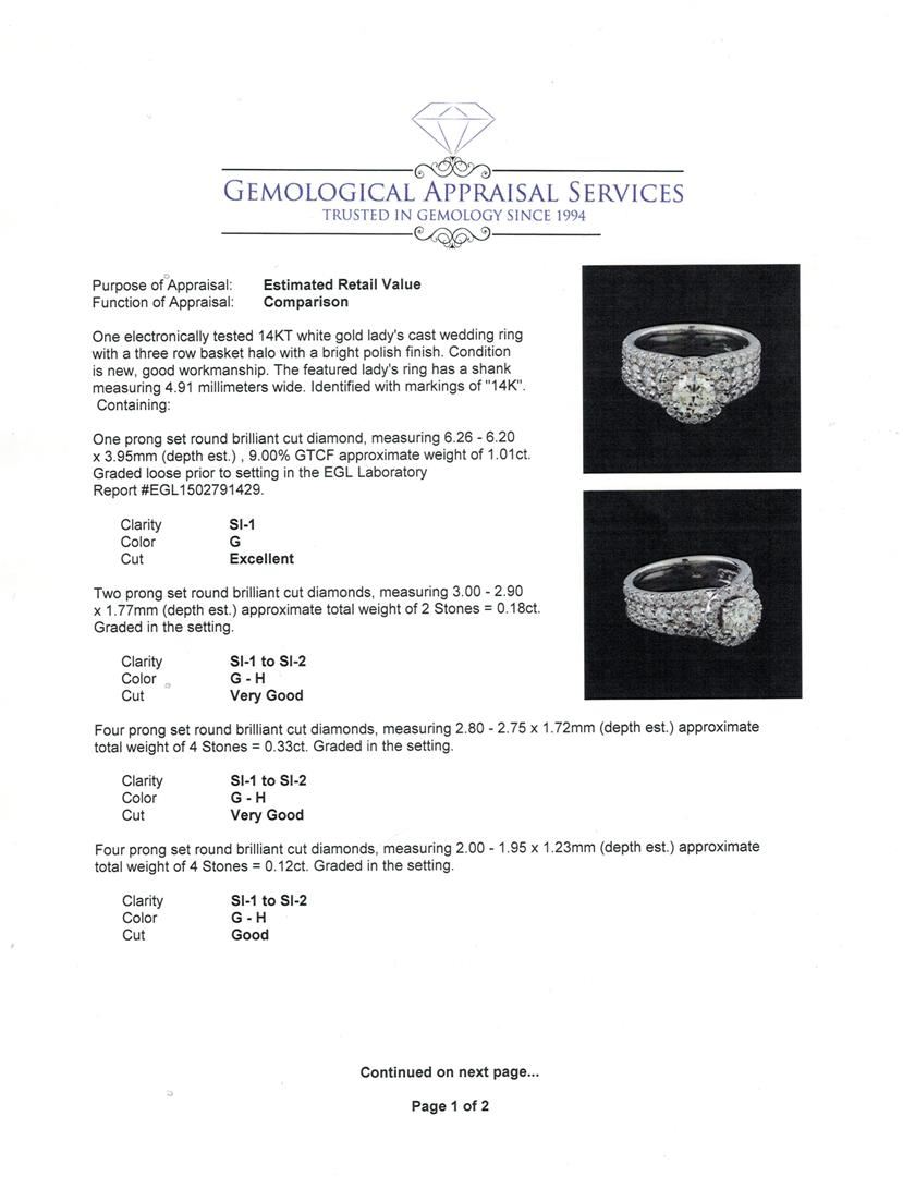 One electronically tested 14KT white gold lady's cast wedding ring with a three row basket halo with a bright polish finish. The featured lady's ring has a shank measuring 4.91 millimeters wide. Identified with markings of "14K". Condition is new, good workmanship. Containing: One prong set round brilliant cut diamond, measuring 6.26 - 6.20 x 3.95mm (depth est.) , 9.00.%. GTCF approximate weight of 1.01ct. Graded loose prior to setting in the EGL Laboratory Report #EGL1502791429. Clarity: SI-1. Color: G. Cut Excellent Two prong set round brilliant cut diamonds, measuring 3.00 - 2.90 x 1.77mm (depth est.) approximate total weight of 2 Stones = 0.18ct. Graded in the setting. Clarity: SI-1 to SI-2. Color: G - Very Good Four prong set round brilliant cut diamonds, measuring 2.80 - 2.75 x 1.72mm (depth est.) approximate total weight of 4 Stones = 0.33ct. Graded in the setting. Clarity: SI-1 to SI-2. Color: G - Very Good Four prong set round brilliant cut diamonds, measuring 2.00 - 1.95 x 1.23mm (depth est.) approximate total weight of 4 Stones = 0.12ct. Graded in the setting. Clarity: SI-1 to SI-2. Color: G - Good Fifty-Eight prong set round brilliant cut diamonds, measuring 1.60 - 1.45 x 0.92mm (depth est.) approximate total weight of 58 Stones = 0.75ct. Graded in the setting. Clarity: SI-2 to I-1. Color: G - I. Cut Good. Total Weight of Diamonds 2.39ct. Total Weight of Ring 7.70gm. GAS Appraised at $20,510.00.