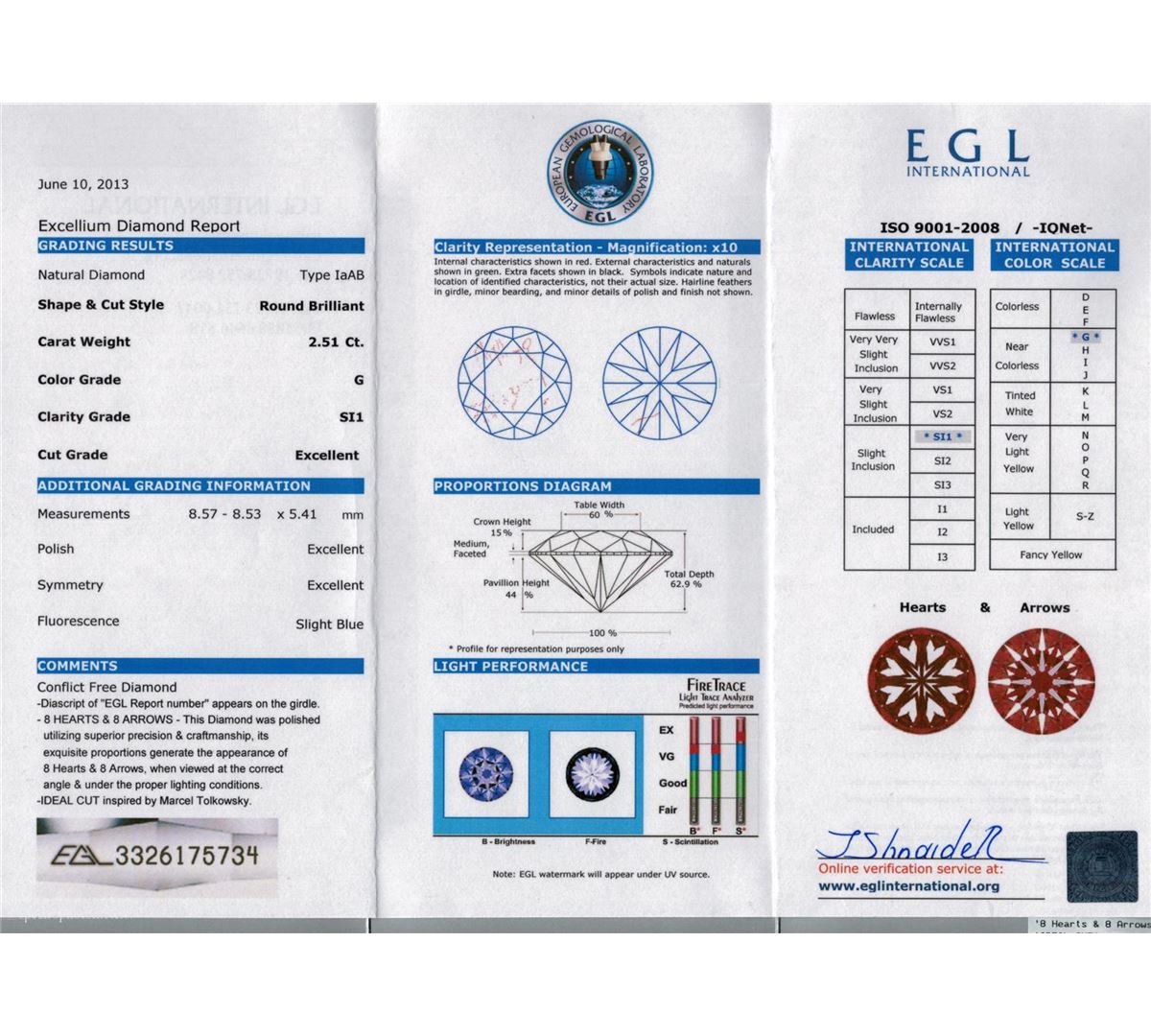 One electronically tested 14KT white gold lady's cast wedding ring with a European shank with a bright polish finish. The featured lady's ring has a shank measuring 2.89 millimeters wide. Identified with markings of "14K". Condition is new, good workmanship. Containing: One prong set round brilliant cut diamond, measuring 8.57 - 8.53 x 5.41mm (depth est.) , 4.00.%. GTCF approximate weight of 2.51ct. Graded loose prior to setting in the EGL Laboratory, Report #EGL3326175734. Clarity: SI-1. Color: Ideal Sixteen prong set round brilliant cut diamonds, measuring 2.60 - 2.50 x 1.56mm (depth est.) approximate total weight of 16 Stones = 0.98ct. Graded in the setting. Clarity: SI-1 to SI-2. Color: G - Good. Total Weight of Diamonds 3.49ct. Total Weight of Ring 6.30gm GAS Appraised at $73,360.00.