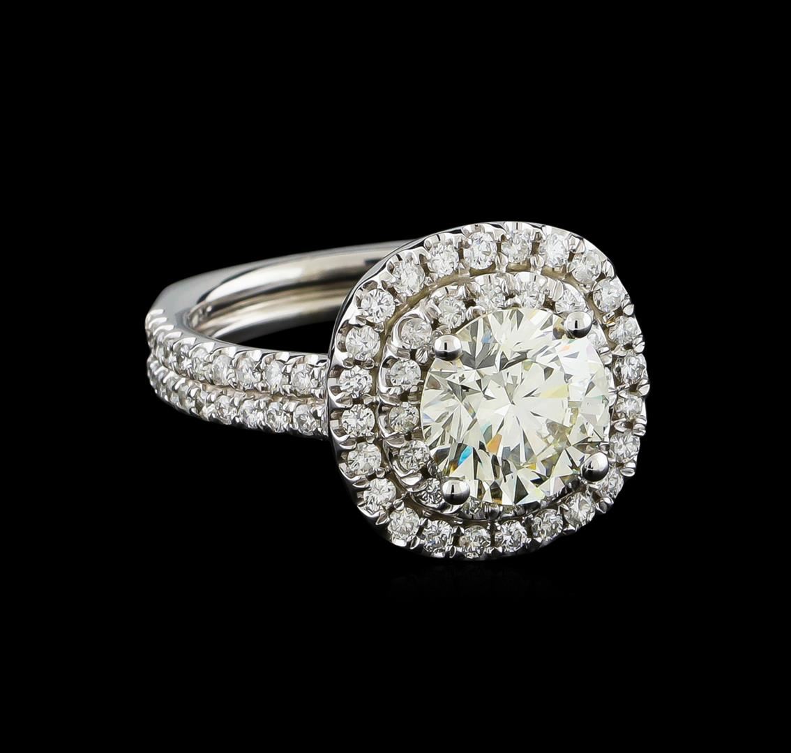 One electronically tested 14KT white gold lady's cast wedding ring with a cathedral shank with a double halo with a bright polish finish. The featured lady's ring has a double shank measuring 3.38 millimeters wide. Identified with markings of "14K". Condition is new, good workmanship. Containing: One prong set round brilliant cut diamond, measuring 8.50 - 8.48 x 5.38mm (depth est.) approximate weight of 2.40ct. Graded loose prior to setting in the EGL Laboratory, Report #EGL3405629635. Clarity: VS-2. Color: Ideal Sixty prong set round brilliant cut diamonds, measuring 1.40 - 1.35 x 0.86mm (depth est.) approximate total weight of 60 Stones = 0.60ct. Graded in the setting. Clarity: SI-2 to I-1. Color: G - Good Thirty prong set round brilliant cut diamonds, measuring 1.30 - 1.20 x 0.78mm (depth est.) approximate total weight of 30 Stones = 0.23ct. Graded in the setting. Clarity: SI-1 to I-1. Color: G - I. Cut Good Twenty-Four prong set round brilliant cut diamonds, measuring 1.55 - 1.45 x 0.93mm (depth est.) approximate total weight of 24 Stones = 0.31ct. Graded in the setting. Clarity: SI-1 to I-1. Color: H - I. Cut Good. Total Weight of Diamonds 3.54ct. Total Weight of Ring 7.70gm GAS Appraised at $81,240.00.