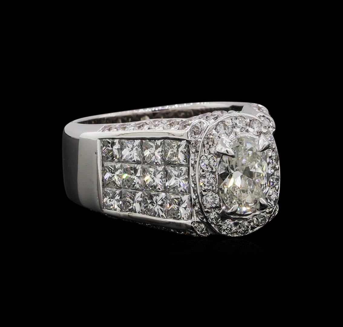 One electronically tested 18KT white gold ladies cast & assembled diamond unity ring with a bright polish finish. The featured diamond is set within a diamond bezel supported by an elaborate cathedral style diamond set under gallery and diamond set shoulders, completed by a six millimeter wide band. Identified with markings of '18K'. Condition is good. Containing: One prong set oval shaped cut diamond, measuring 7.68 x 5.86 x 3.42mm (depth est.) approximate weight of 1.00ct. EGL Report attached. Graded loose prior to setting in the EGL Laboratory Report #US 915204402D. Clarity I-1. Color: G Depth 58.4%. Table: 61.0%. Pavil. Depth%. 41.5%. Twenty-Four invisible set princess cut diamonds, measuring 2.60 x 2.50 x 1.88mm (depth est.) approximate total weight of 24 Stones = 2.50ct. Graded in the setting. Clarity VS-2 to SI-1. Color: F - H Seventy-Seven bead set round brilliant cut diamonds, measuring 1.70 - 0.90 x 0.78mm (depth est.) approximate total weight of 77 Stones = 1.12ct. Graded in the setting. Clarity VS-1 to VS-2. Color: F - H. Total Weight of Diamonds 4.62ct.. Total Weight of Ring 13.04gm. AIG Appraised at $22,625.00.