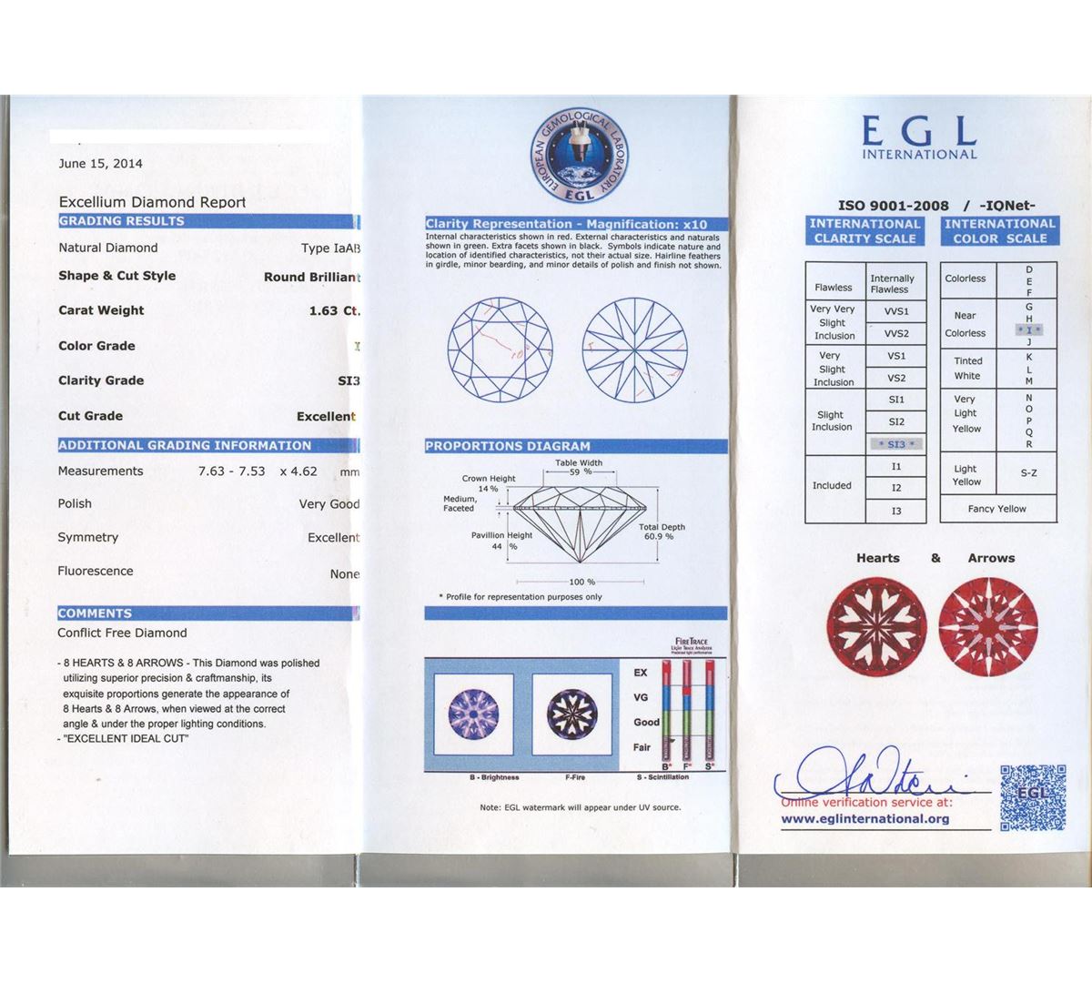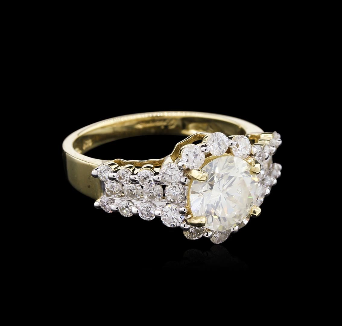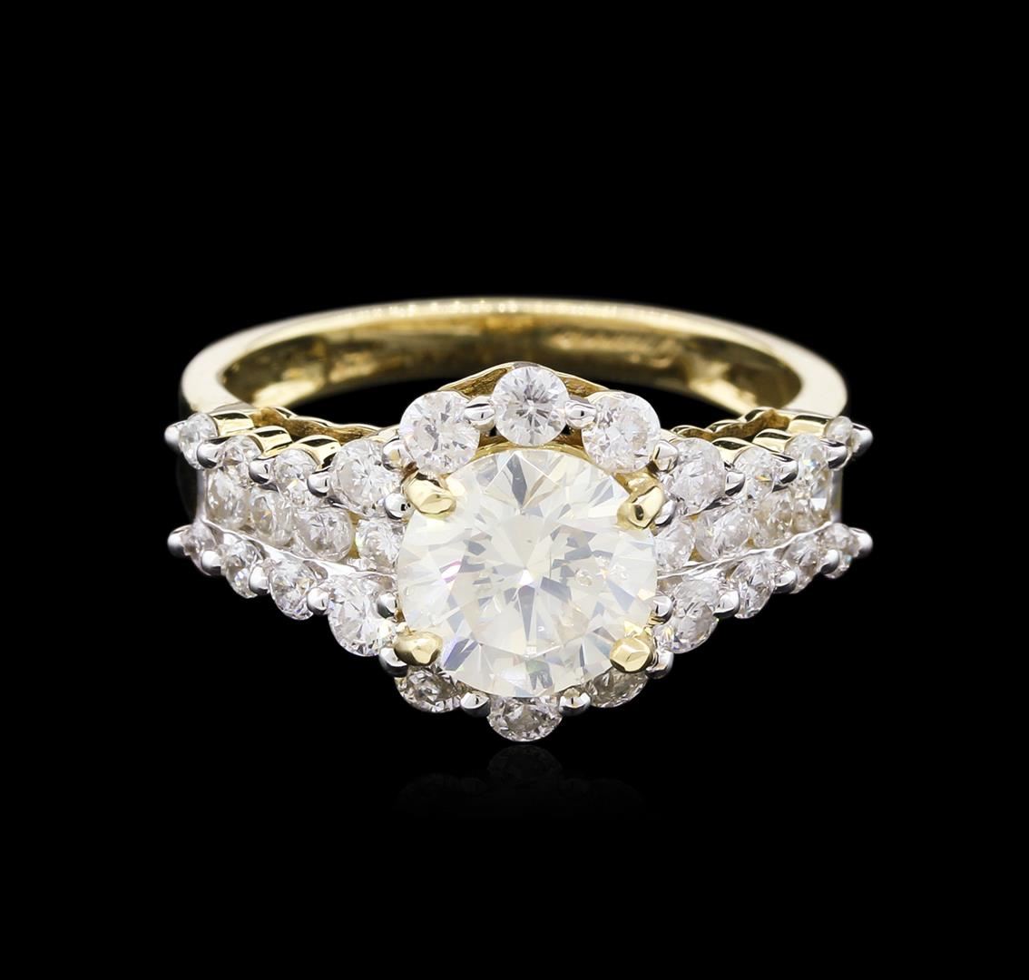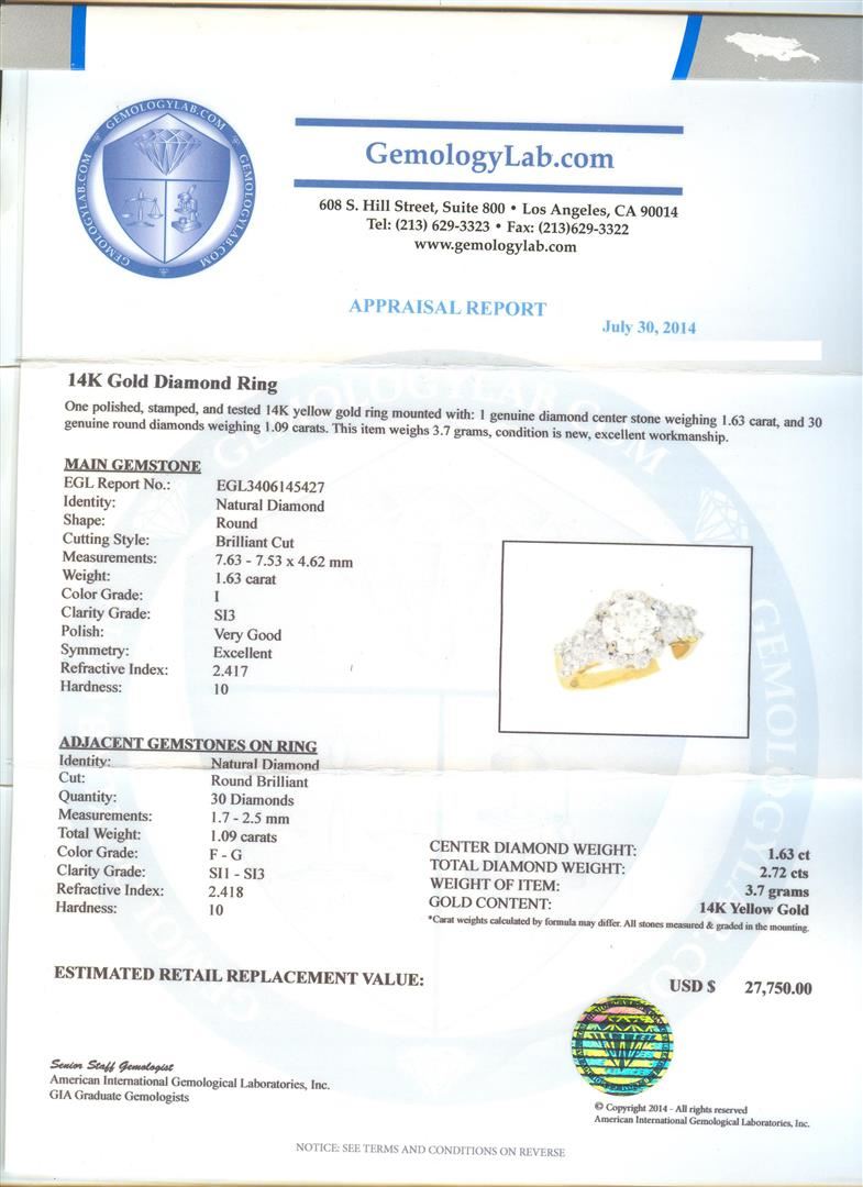 One polished, stamped, and tested 14K yellow gold ring mounted with: 1 genuine diamond center stone weighing 1.63 carat, and 30 genuine round diamonds weighing 1.09 carats. This item weighs 3.7 grams, condition is new, excellent workmanship. Main Gemstone: EGL Report No.: EGL3406145427. Identity: Natural Diamond. Shape: Round. Cutting Style: Brilliant Cut. Measurements: 7.63-7.53 x 4.62 mm. Weight: 1.63 carat. Color Grade: I. Clarity Grade: SI3. Polish: Very Good. Symmetry: Excellent. Refractive Index: 2.417. Hardness: 10. Adjacent Gemstones On Ring: Identity: Natural Diamond. Cut: Round Brilliant. Quantity: 30 Diamonds. Measurements: 1.7-2.5 mm. Total Weight: 1.09 carats. Color Grade: F-G. Clarity Grade: SI1-SI3. Refractive Index 2.418. Hardness: 10. Center Diamond Weight: 1.63ct. Total Diamond Weight: 2.72cts. Weight of Item: 3.7 grams. Gold Content: 14K Yellow Gold. AIGL Appraised at $27,750.00.