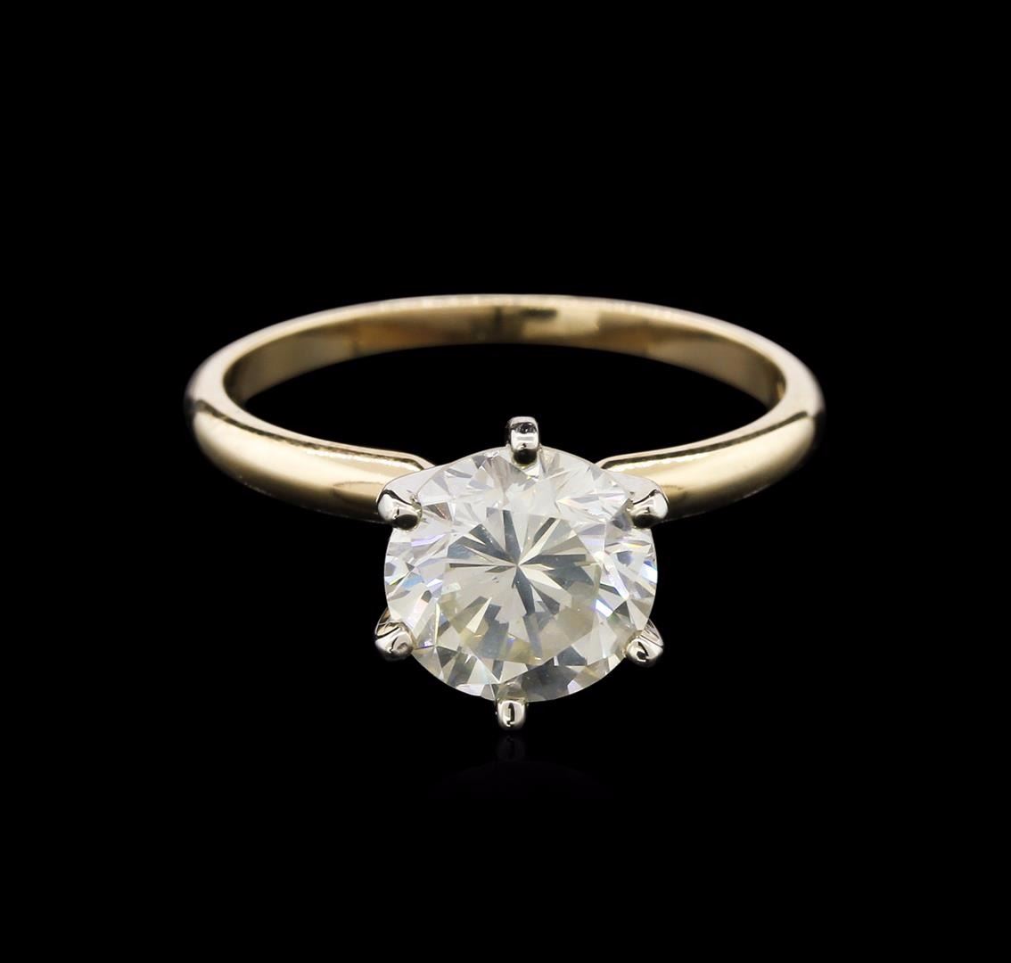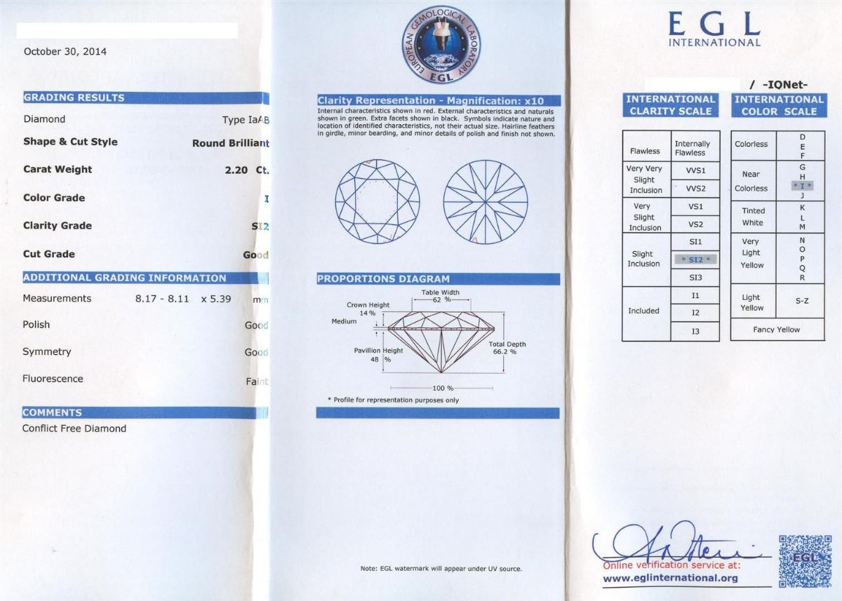 One polished, stamped, and tested 14K yellow gold ring mounted with one genuine diamond weighing 2.20 carat. This item weighs 2.9 grams, condition is new, excellent workmanship. Main Gemstone: EGL Report No.: EGL3410154826. Identity: Natural Diamond. Shape: Round. Cutting Style: Brilliant Cut. Measurements: 2.17 - 8.11 x 5.39 mm. Weight: 2.20 carat. Clarity Grade: SI2. Color Grade: I. Polish: Good. Symmetry: Good. Refractive Index: 2.417. Chemical Formula: C. Hardness: 10. Diamond Weight: 2.20ct. Weight of Item: 2.9 grams. Gold Content: 14K Yellow Gold. AIGL Appraised at $32,340.00.