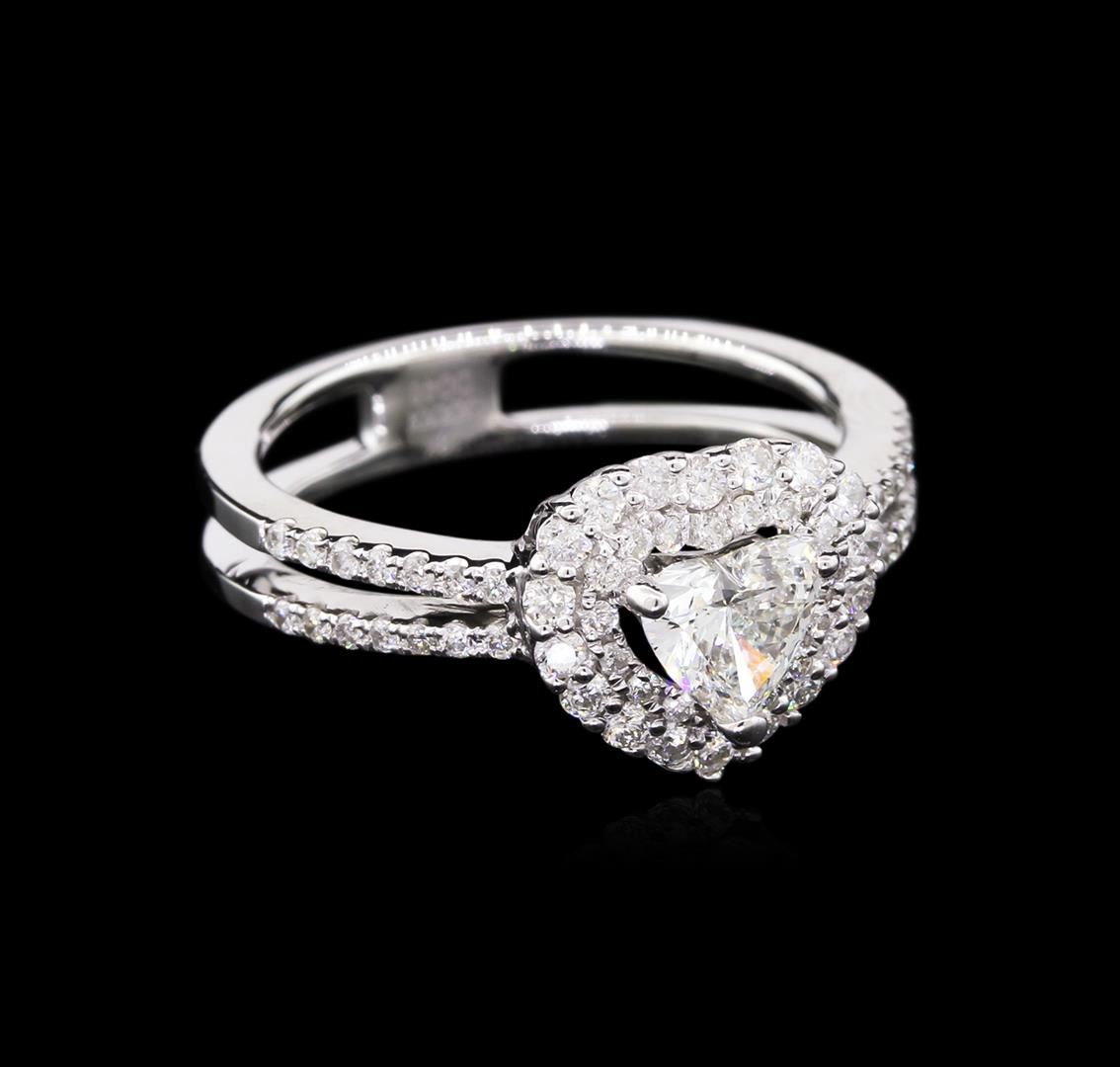 One polished, stamped, and tested 18K white gold ring mounted with: 1 genuine diamond center stone weighing 0.53 carat, and 62 genuine round diamonds weighing 0.48 carats. This item weighs 4.4 grams, condition is new, excellent workmanship. Main Gemstone: EGL Report No.: EGL3407488539. Identity: Natural Diamond. Shape: Heart. Cutting Style: Brilliant Cut. Measurements: 5.59 x 5.54 x 3.04 mm. Weight: 0.53 carat. Color Grade: D. Clarity Grade: VS2. Polish: Excellent. Symmetry: Excellent. Refractive Index: 2.417. Hardness: 10. Adjacent Gemstones On Ring: Identity: Natural Diamond. Shape: Round. Cutting Style: Brilliant Cut. Quantity: 62 Diamonds. Measurements: 1.0 - 1.7 mm. Total Weight: 0.48 carats. Color Grade: E-F. Clarity Grade: SI1-SI2. Refractive Index: 2.418. Hardness: 10. Center Diamond Weight: 0.53ct. Total Diamond Weight: 1.01cts. Weight Of Item: 4.4 grams. Gold Content: 18KT White Gold. AIGL Appraised.
