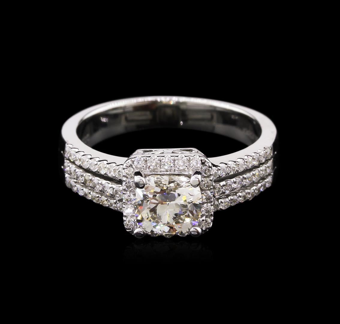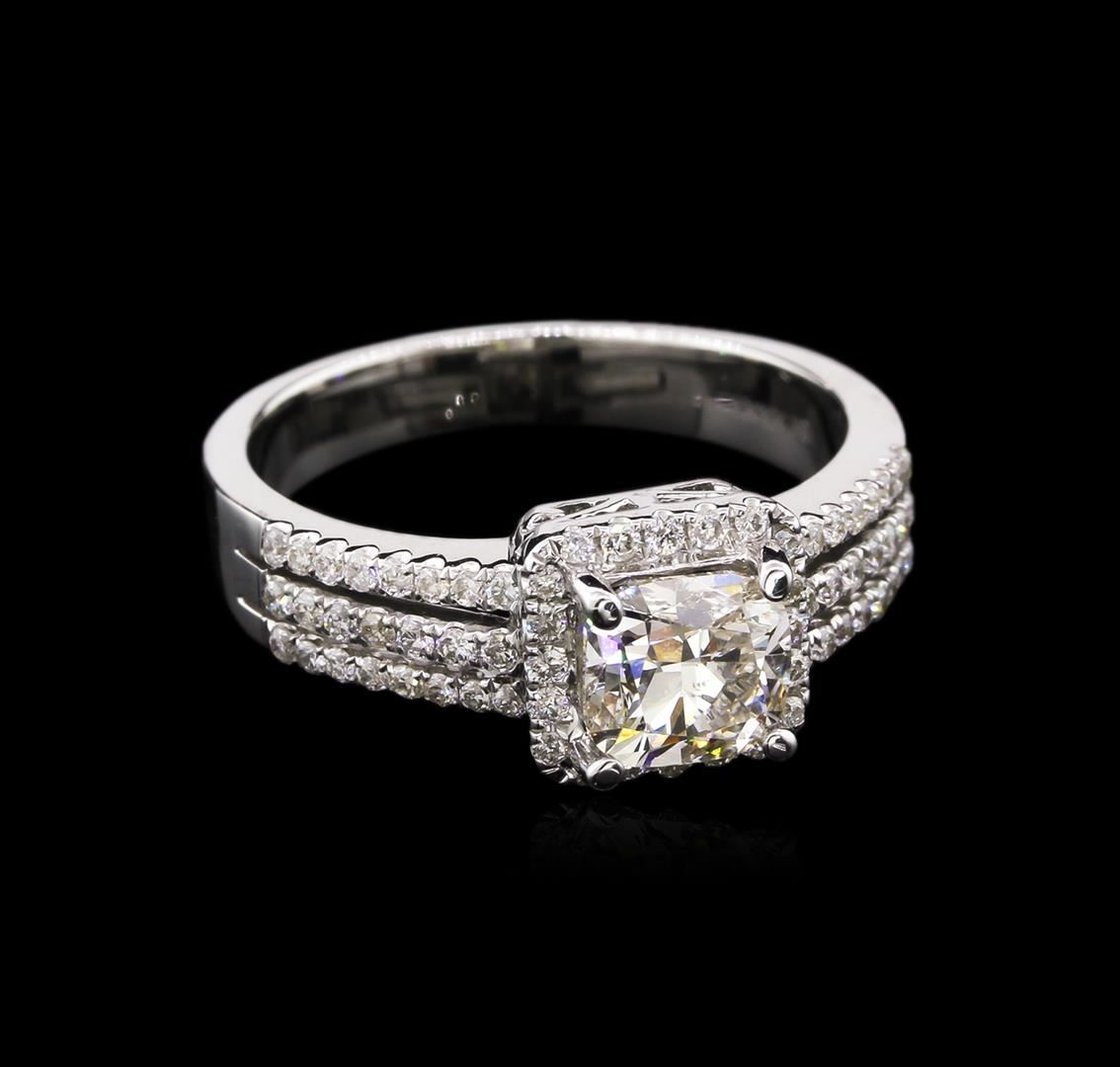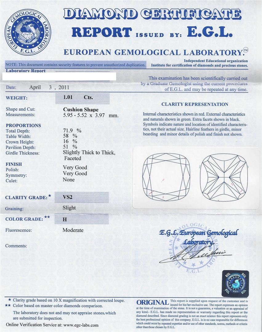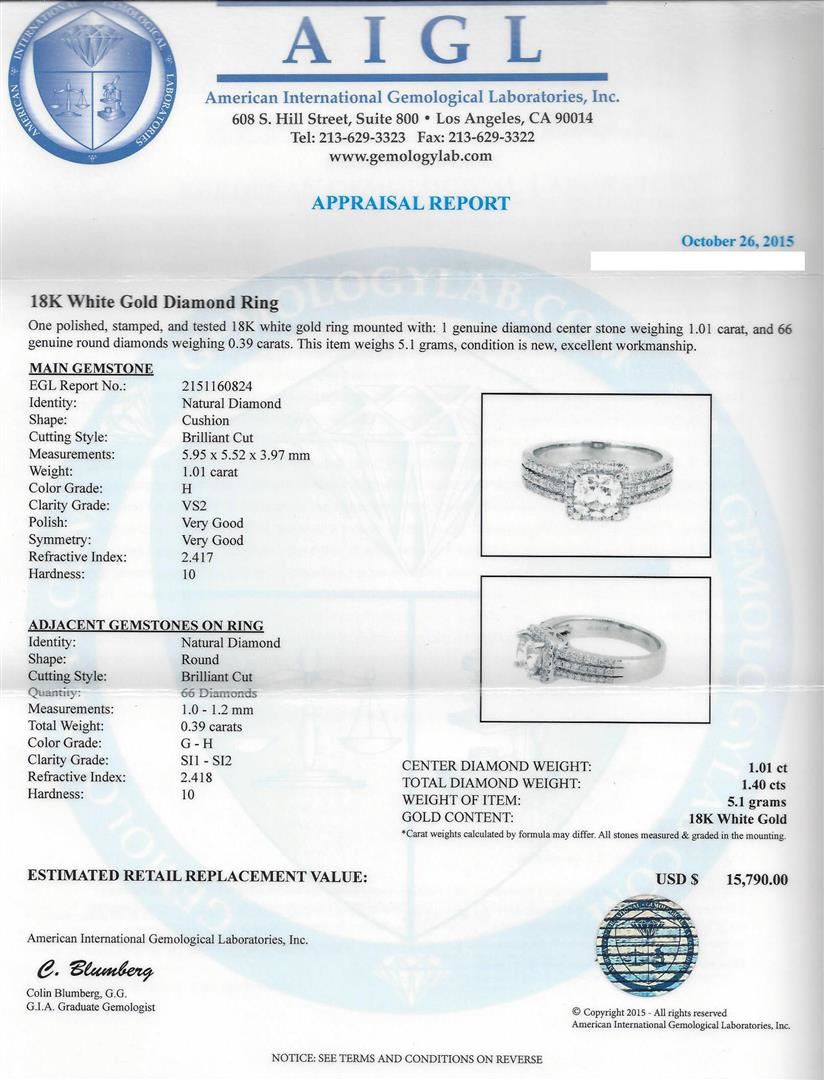 One polished, stamped, and tested 18K white gold ring mounted with: 1 genuine diamond center stone weighing 1.01 carat, and 66 genuine round diamonds weighing 0.39 carats. This item weighs 5.1 grams, condition is new, excellent workmanship. Main Gemstone: EGL Report No.: 2151160824. Identity: Natural Diamond. Shape: Cushion. Cutting Style: Brilliant Cut. Measurements: 5.95 x 5.52 x 3.97 mm. Weight: 1.01 carat. Color Grade: H. Clarity Grade: VS2. Polish: Very Good. Symmetry: Very Good. Refractive Index: 2.417. Hardness: 10. Adjacent Gemstones On Ring: Identity: Natural Diamond. Shape: Round. Cutting Style: Brilliant Cut. Quantity: 66 Diamonds. Measurements: 1.0 - 1.2 mm. Total Weight: 0.39 carats. Color Grade: G-H. Clarity Grade: SI1-SI2. Refractive Index: 2.418. Hardness: 10. Center Diamond Weight: 1.01ct. Total Diamond Weight: 1.40cts. Weight Of Item: 5.1 grams. Gold Content: 18KT White Gold. AIGL Appraised.
