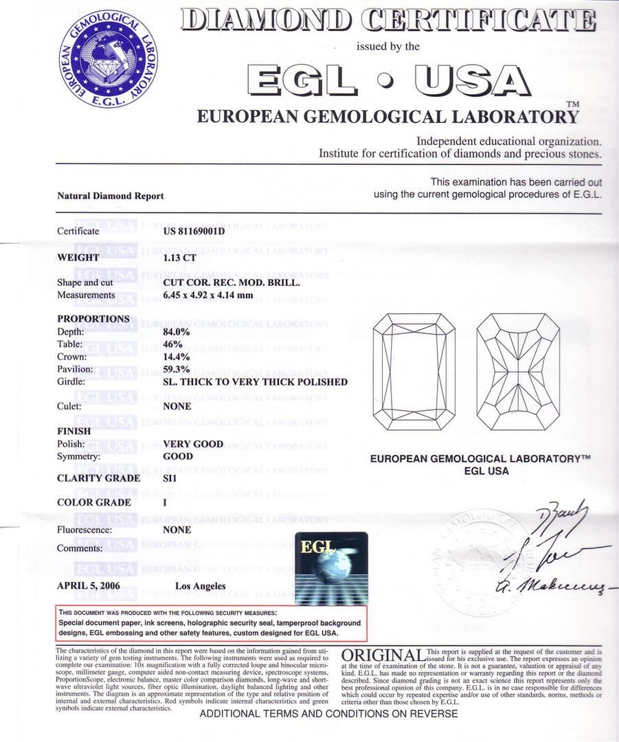 One ring featuring: 14KT white gold weighing 2.90 grams containing one diamond center stone with a total weight of 1.13ct and side diamonds with a total weight of 0.21ct. EGL USA Appraised.