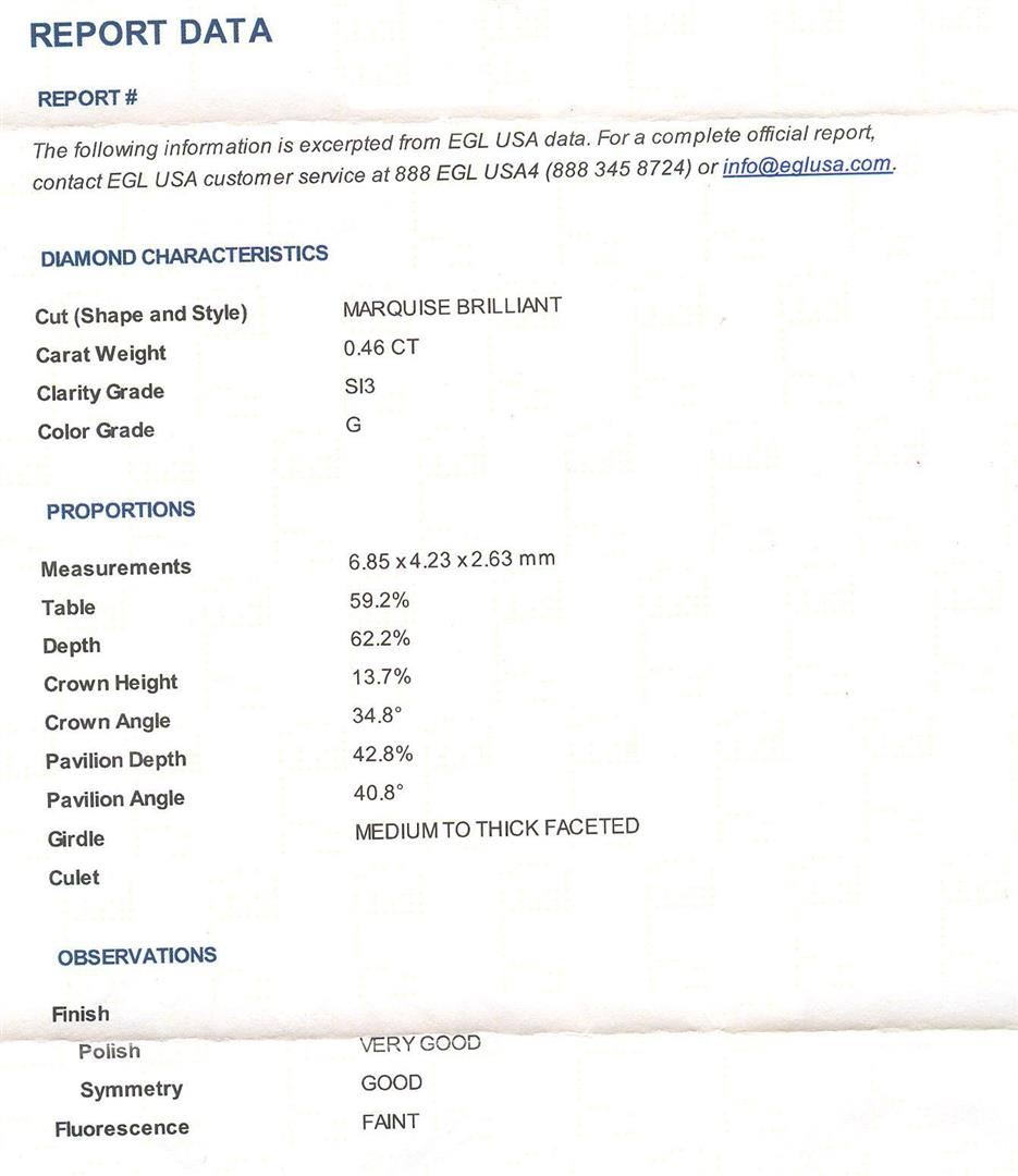 One electronically tested 18KT white gold ladies cast diamond unity ring with a bright polish finish. The featured diamond is set within a diamond bezel supported by diamond set shoulders, completed by a two millimeter wide band. Trademark is HANA. Identified with markings of "18K". Condition is new, good workmanship. Containing: One prong set marquise shaped cut diamond, measuring 6.85 x 4.23 x 2.63mm exact weight 0.46ct with a faint fluorescence. EGL Report attached. Graded loose prior to setting in the EGL Laboratory Report #US 905705616D. Clarity: SI-3. Color: G. Depth 62.2%. Table 59.2%. Pavil. Depth%. 42.8%. Crown Angle 34.8 Degrees Thirty-Four prong set round brilliant cut diamonds approximate total weight of 34 Stones = 0.28ct. Graded in the setting. Clarity: SI-1 to I-1. Color: G - I. Total Weight of Diamonds 0.74ct. AIG Appraised at $4,145.00.
