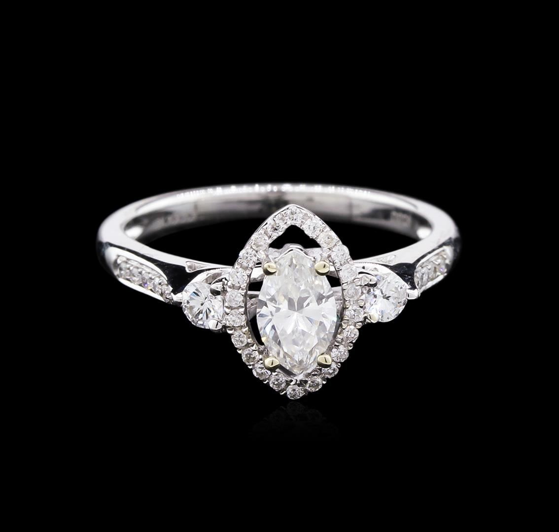 One electronically tested 18KT white gold ladies cast diamond unity ring with a bright polish finish. The featured diamond is set within a diamond bezel supported by diamond set shoulders, completed by a two millimeter wide band. Trademark is HANA. Identified with markings of "18K". Condition is new, good workmanship. Containing: One prong set marquise shaped cut diamond, measuring 6.85 x 4.23 x 2.63mm exact weight 0.46ct with a faint fluorescence. EGL Report attached. Graded loose prior to setting in the EGL Laboratory Report #US 905705616D. Clarity: SI-3. Color: G. Depth 62.2%. Table 59.2%. Pavil. Depth%. 42.8%. Crown Angle 34.8 Degrees Thirty-Four prong set round brilliant cut diamonds approximate total weight of 34 Stones = 0.28ct. Graded in the setting. Clarity: SI-1 to I-1. Color: G - I. Total Weight of Diamonds 0.74ct. AIG Appraised at $4,145.00.