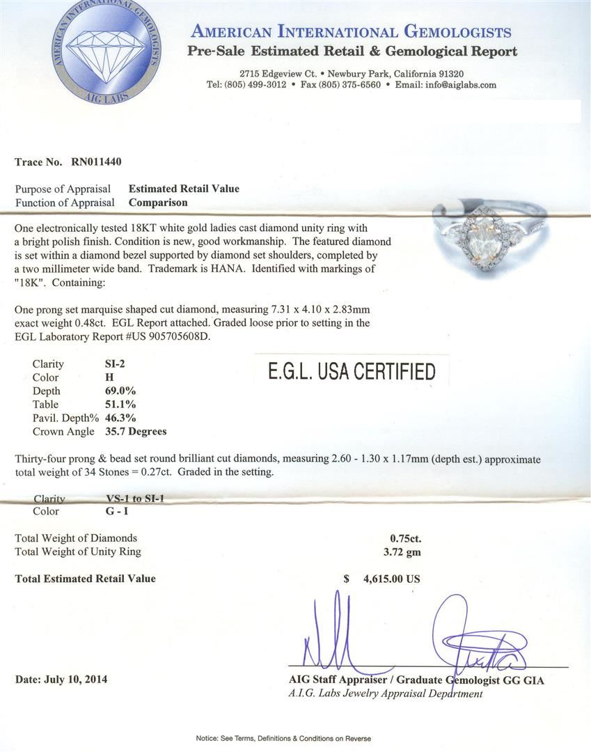 One electronically tested 18KT white gold ladies cast diamond unity ring with a bright polish finish. The featured diamond is set within a diamond bezel supported by diamond set shoulders, completed by a two millimeter wide band. Trademark is HANA. Identified with markings of "18K". Condition is new, good workmanship. Containing: One prong set marquise shaped cut diamond, measuring 7.31 x 4.10 x 2.83mm exact weight 0.48ct. EGL Report attached. Graded loose prior to setting in the EGL Laboratory Report #US 905705608D. Clarity: SI-2. Color: H. Depth 69.0%. Table 51.1%. Pavil. Depth%. 46.3%. Crown Angle 35.7 Degrees Thirty-Four prong & bead set round brilliant cut diamonds, measuring 2.60 - 1.30 x 1.17mm (depth est.) approximate total weight of 34 Stones = 0.27ct. Graded in the setting. Clarity: VS-1 to SI-1. Color: G - I. Total Weight of Diamonds 0.75ct. AIG Appraised at $4,615.00.