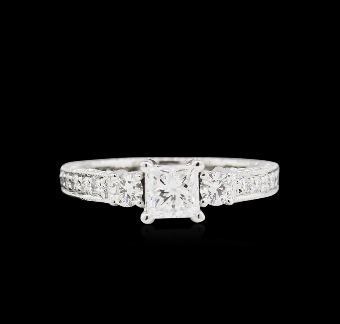 One electronically tested 18KT white gold lady's cast 3-stone wedding ring with a cathedral shank with a bright polish with milgrain detailing finish. The featured lady's ring has hand engraved details and a shank measuring 2.25 millimeters wide. Identified with markings of "18K 750". Condition is new, good workmanship. Containing: One prong set princess cut diamond, measuring 4.81 x 4.78 x 3.62mm (depth est.) approximate weight of 0.71ct. EGL USA Laboratory Report #913700504D. Clarity: SI-2 to I-1. Color: D. Cut Very Good Two prong set round brilliant cut diamonds, measuring 3.15 - 3.13 x 1.88mm (depth est.) approximate total weight of 2 Stones = 0.22ct. Clarity: VS-2 to SI-1. Color: G - Good Ten prong set round brilliant cut diamonds, measuring 1.80 - 1.70 x 1.05mm (depth est.) approximate total weight of 10 Stones = 0.18ct. Graded in the setting. Clarity: VS-2 to SI-1. Color: H - I. Cut Very Good. Total Weight of Diamonds 1.11ct. Total Weight of Ring 4.80gm. GAS Appraised at $7,020.00.