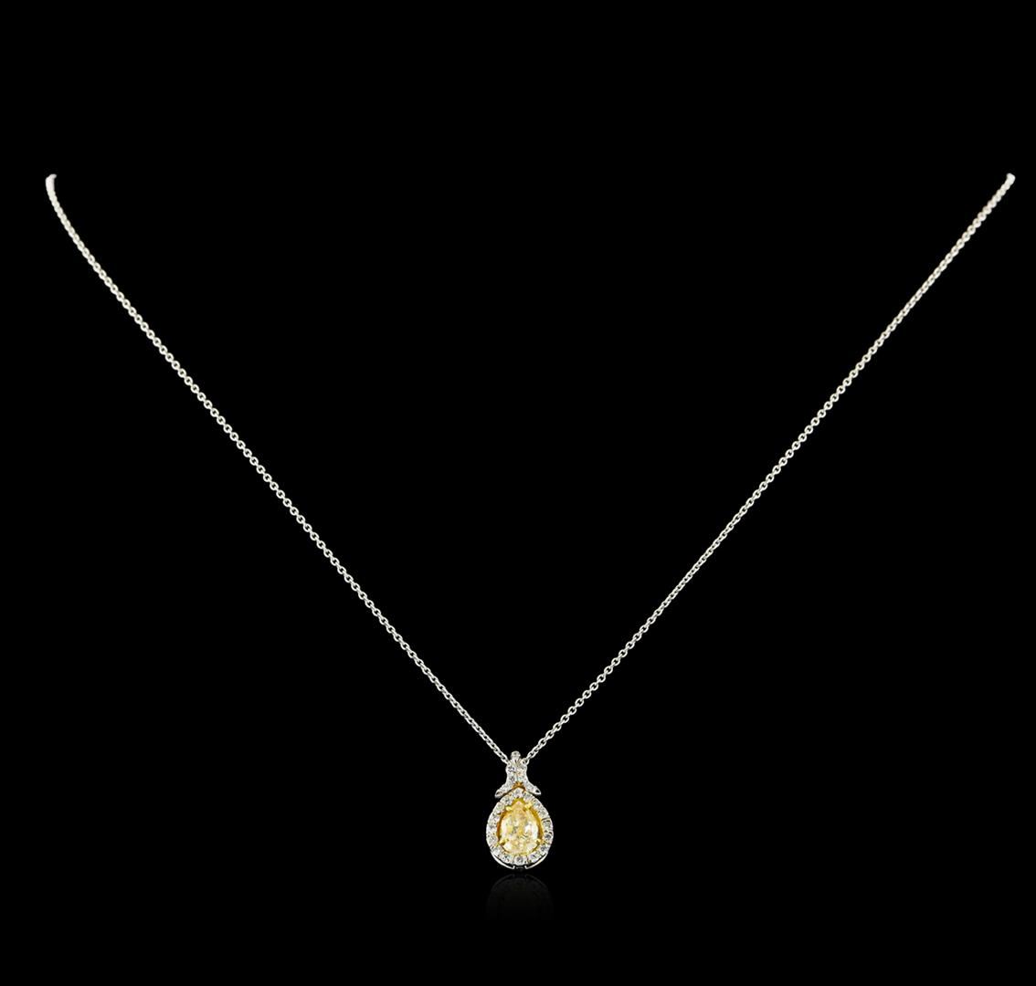 One pendant with chain featuring: platinum consisting of one pear brilliant cut diamond measuring 7.10 x 5.00 x 3.65mm weighing 1.01ct. Diamond is fancy yellow in color and SI1 in clarity. Pendant also contains twenty three (23) round brilliant cut diamonds weighing 0.27ct. Diamonds are F-G in color and VS1-VS2 in clarity. Grading as mounting permits. EGL USA Appraised.