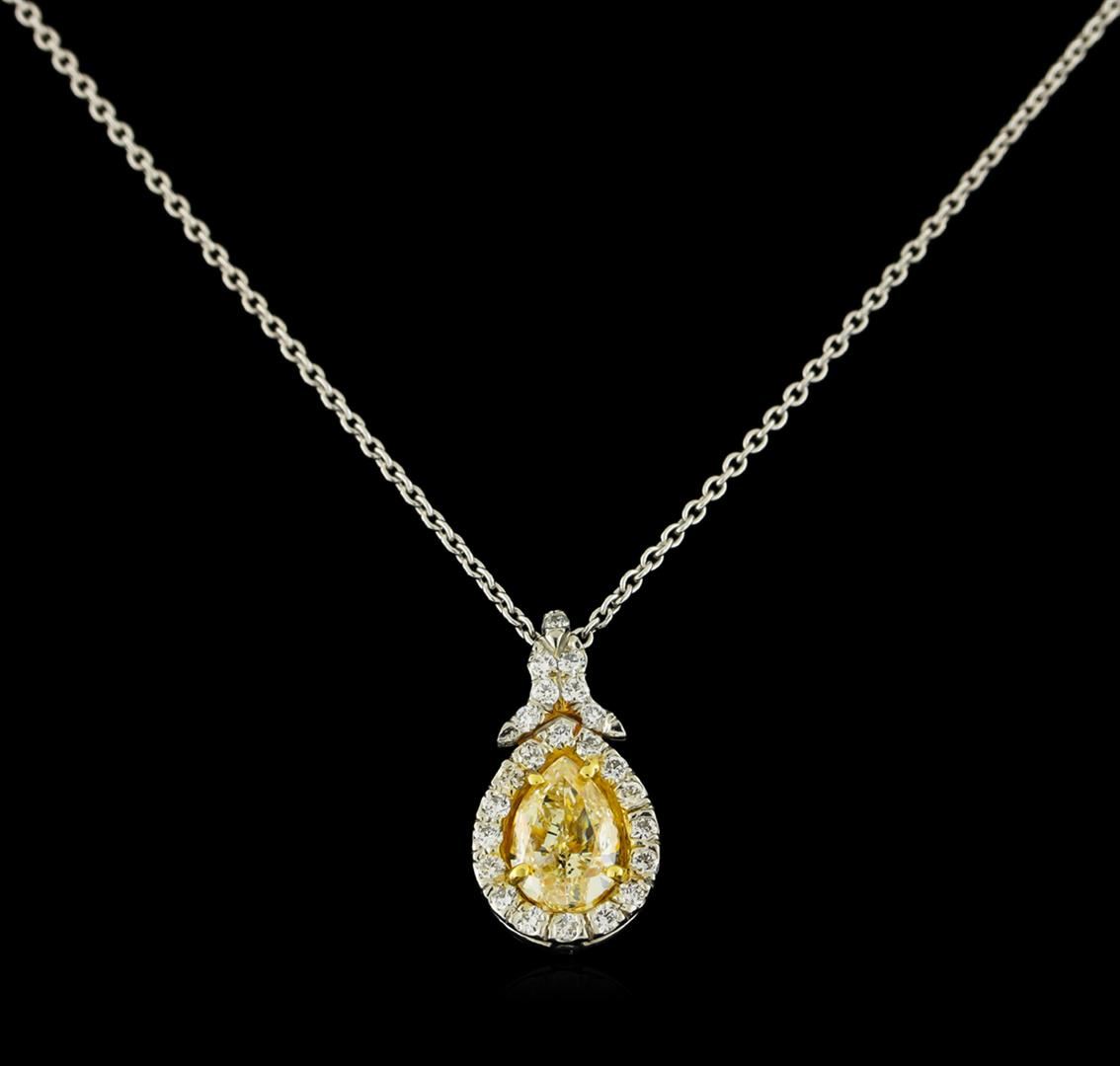 One pendant with chain featuring: platinum consisting of one pear brilliant cut diamond measuring 7.10 x 5.00 x 3.65mm weighing 1.01ct. Diamond is fancy yellow in color and SI1 in clarity. Pendant also contains twenty three (23) round brilliant cut diamonds weighing 0.27ct. Diamonds are F-G in color and VS1-VS2 in clarity. Grading as mounting permits. EGL USA Appraised.