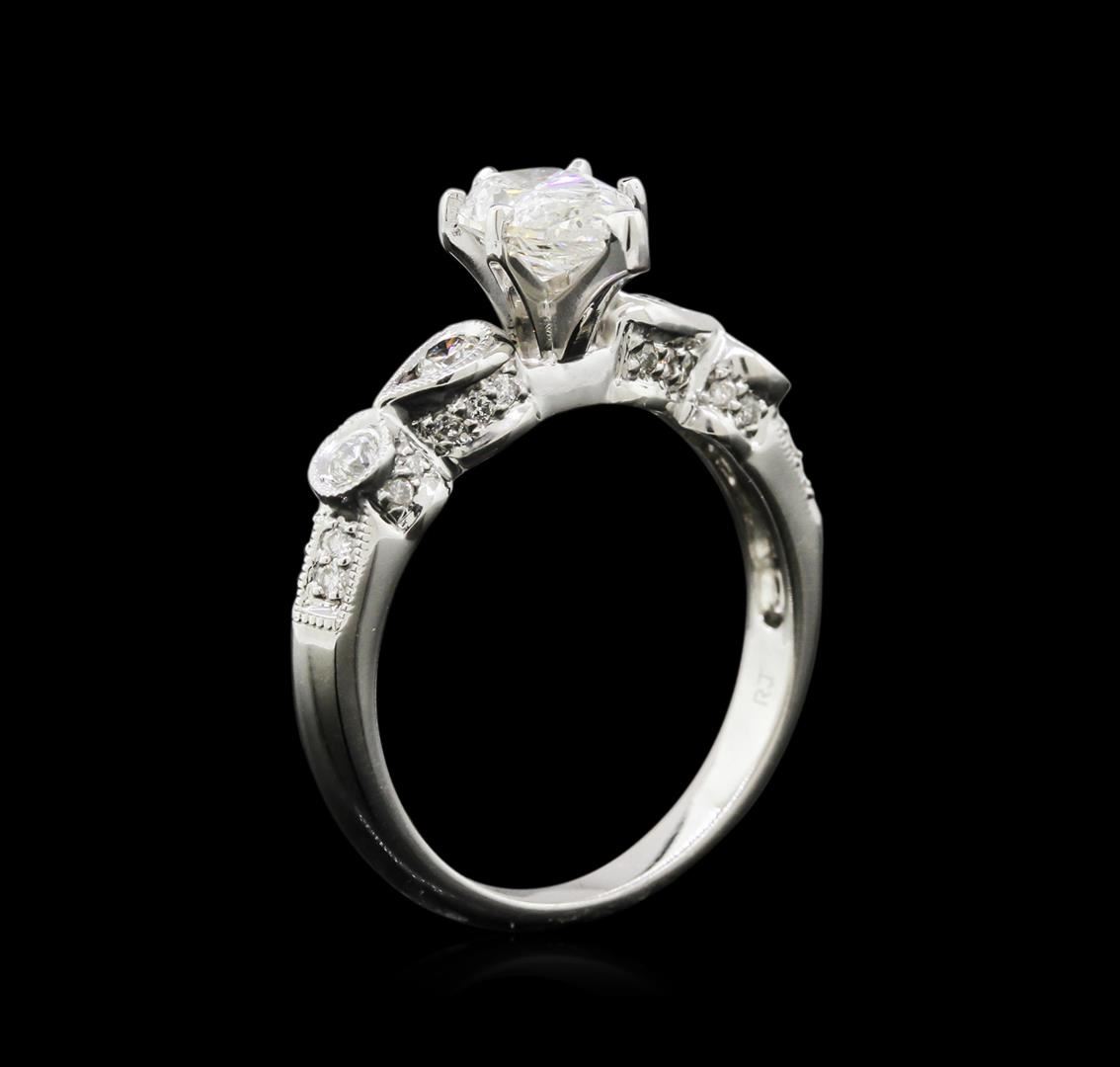 One electronically tested 18KT white gold lady's combination cast & assembled straight line wedding ring with a bright polish with milgrain detailing finish. The featured lady's ring has a shank measuring 2.69 millimeters in width. Identified with markings of "18K 750". Condition is new, good workmanship. Containing: One prong set pear shaped cut diamond, measuring 8.13 x 5.29 x 3.56mm (depth est.) approximate weight of 0.93ct. EGL USA Laboratory Report #911386320D. Clarity: SI-2 to I-1. Color: Very Good Four bezel set round brilliant cut diamonds, measuring 2.30 - 2.20 x 1.42mm (depth est.) approximate total weight of 4 Stones = 0.18ct. Graded in the setting. Clarity: SI-1 to SI-2. Color: H - I. Cut Good Twenty-Eight prong set round brilliant cut diamonds, measuring 1.30 - 1.20 x 0.79mm (depth est.) approximate total weight of 28 Stones = 0.21ct. Graded in the setting. Clarity: VS-2 to SI-2. Color: H - I. Cut Good. Total Weight of Diamonds 1.32ct. Total Weight of Wedding Ring 4.20gm. GAS Appraised at $8,895.00.