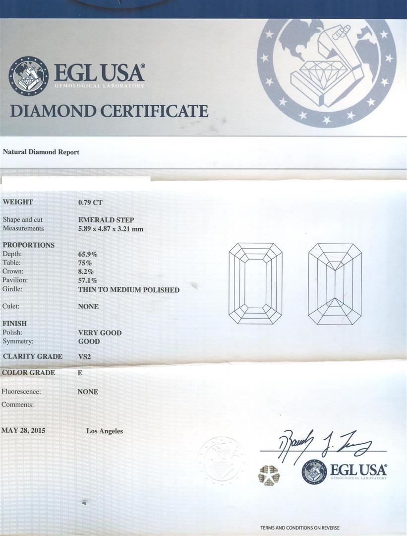 One electronically tested 18KT white gold lady's cast wedding ring with a bright polish with milgrain detailing finish. The featured lady's ring has a shank measuring 2.00 millimeters wide. Identified with markings of "18K". Condition is new, good workmanship. Containing: One prong set emerald cut diamond, measuring 5.89 x 4.87 x 3.21mm (depth est.) approximate weight of 0.79ct. EGL USA Laboratory Report # 913600403. Clarity: VS-2. Color: E. Cut Very Good Four bezel set princess cut diamonds, measuring 2.10 x 1.90 x 1.43mm (depth est.) approximate total weight of 4 Stones = 0.20ct. Graded in the setting. Clarity: VS-1 to VS-2. Color: Very Good Four bezel set round brilliant cut diamonds, measuring 2.60 - 2.50 x 1.92mm (depth est.) approximate total weight of 4 Stones = 0.30ct. Graded in the setting. Clarity: VS-2 to SI-1. Color: G - Very Good Two bezel set round brilliant cut diamonds, measuring 2.30 - 2.20 x 1.44mm (depth est.) approximate total weight of 2 Stones = 0.10ct. Graded in the setting. Clarity: VS-2. Color: G - Very Good. Total Weight of Diamonds 1.39ct. Total Weight of Ring 4.10gm. GAS Appraised at $9,755.00.