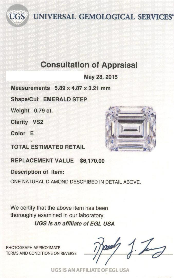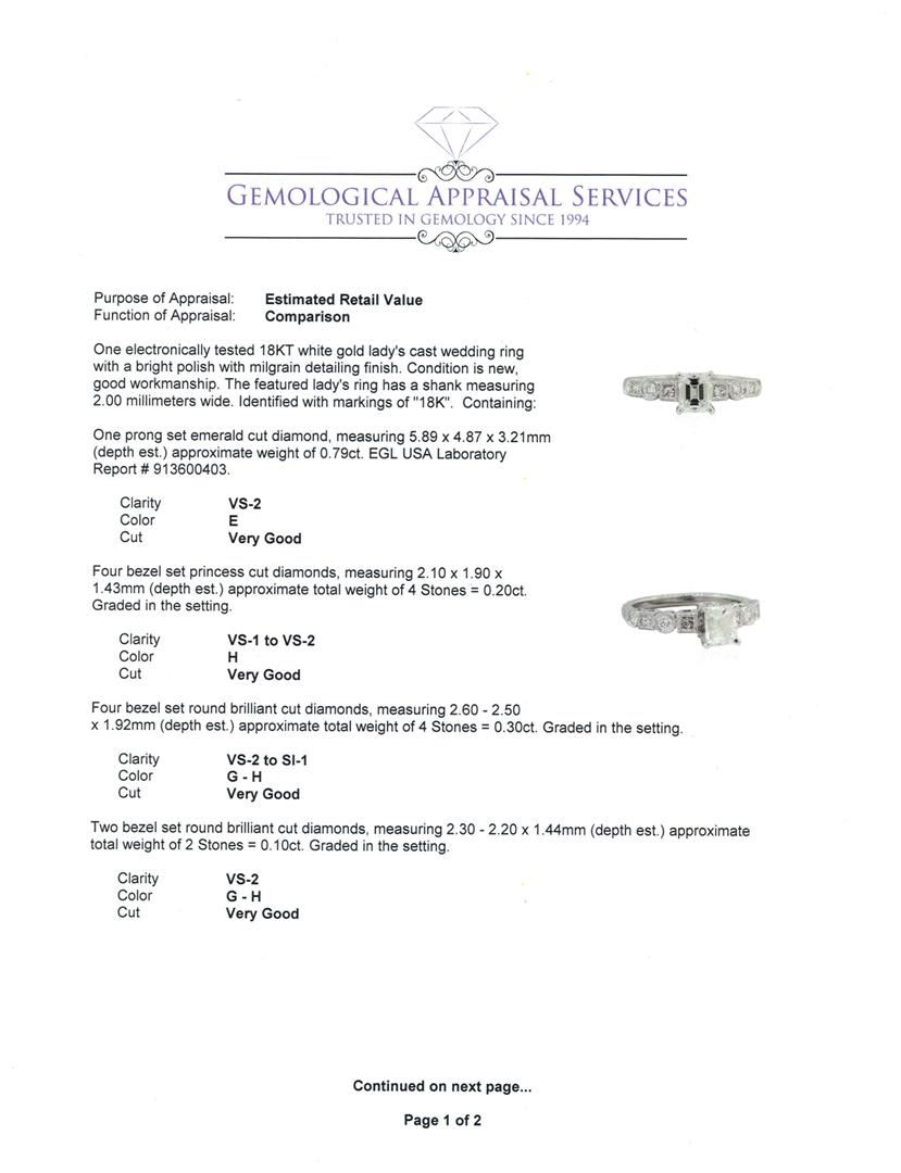 One electronically tested 18KT white gold lady's cast wedding ring with a bright polish with milgrain detailing finish. The featured lady's ring has a shank measuring 2.00 millimeters wide. Identified with markings of "18K". Condition is new, good workmanship. Containing: One prong set emerald cut diamond, measuring 5.89 x 4.87 x 3.21mm (depth est.) approximate weight of 0.79ct. EGL USA Laboratory Report # 913600403. Clarity: VS-2. Color: E. Cut Very Good Four bezel set princess cut diamonds, measuring 2.10 x 1.90 x 1.43mm (depth est.) approximate total weight of 4 Stones = 0.20ct. Graded in the setting. Clarity: VS-1 to VS-2. Color: Very Good Four bezel set round brilliant cut diamonds, measuring 2.60 - 2.50 x 1.92mm (depth est.) approximate total weight of 4 Stones = 0.30ct. Graded in the setting. Clarity: VS-2 to SI-1. Color: G - Very Good Two bezel set round brilliant cut diamonds, measuring 2.30 - 2.20 x 1.44mm (depth est.) approximate total weight of 2 Stones = 0.10ct. Graded in the setting. Clarity: VS-2. Color: G - Very Good. Total Weight of Diamonds 1.39ct. Total Weight of Ring 4.10gm. GAS Appraised at $9,755.00.