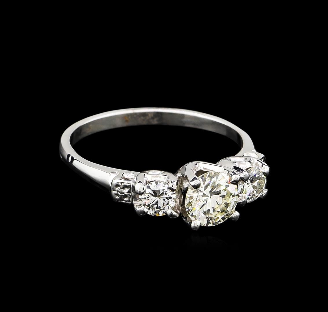 One electronically tested platinum ladies cast & assembled diamond ring with a bright polish finish. Condition is good. The featured diamond is set within a 14KT white gold section supported by diamond set platinum shoulders and completed by a two millimeter wide platinum badn. Containing: One prong set round brilliant cut diamond, measuring 6.18 - 6.07 x 3.65mm exact weight of 0.85ct. Graded loose prior to setting in the EGL Laboratory, Report # US906174109D. Clarity: SI-2. Color: K. Depth: 59.6%. Table: 63.0%. Pavil Depth %: 43.9%. Two prong set round brilliant cut diamonds, measuring 4.00 - 3.90 x 2.37mm (depth est.) approximate total weight of 2 Stones = 0.55ct. Graded in the setting. Clarity: VS-1 to VS-2. Color: H - I. Total Weight of Diamonds: 1.40ct. Total Weight of Ring: 5.90 grams. AIG Appraised at $12,565.00.