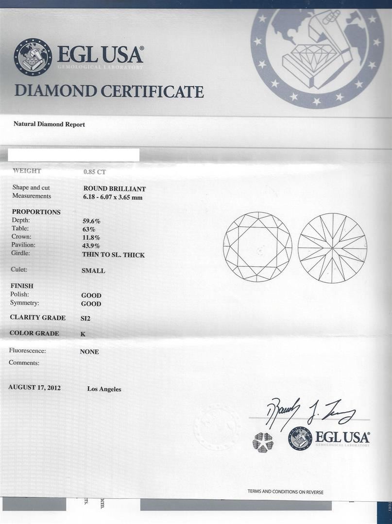 One electronically tested platinum ladies cast & assembled diamond ring with a bright polish finish. Condition is good. The featured diamond is set within a 14KT white gold section supported by diamond set platinum shoulders and completed by a two millimeter wide platinum badn. Containing: One prong set round brilliant cut diamond, measuring 6.18 - 6.07 x 3.65mm exact weight of 0.85ct. Graded loose prior to setting in the EGL Laboratory, Report # US906174109D. Clarity: SI-2. Color: K. Depth: 59.6%. Table: 63.0%. Pavil Depth %: 43.9%. Two prong set round brilliant cut diamonds, measuring 4.00 - 3.90 x 2.37mm (depth est.) approximate total weight of 2 Stones = 0.55ct. Graded in the setting. Clarity: VS-1 to VS-2. Color: H - I. Total Weight of Diamonds: 1.40ct. Total Weight of Ring: 5.90 grams. AIG Appraised at $12,565.00.