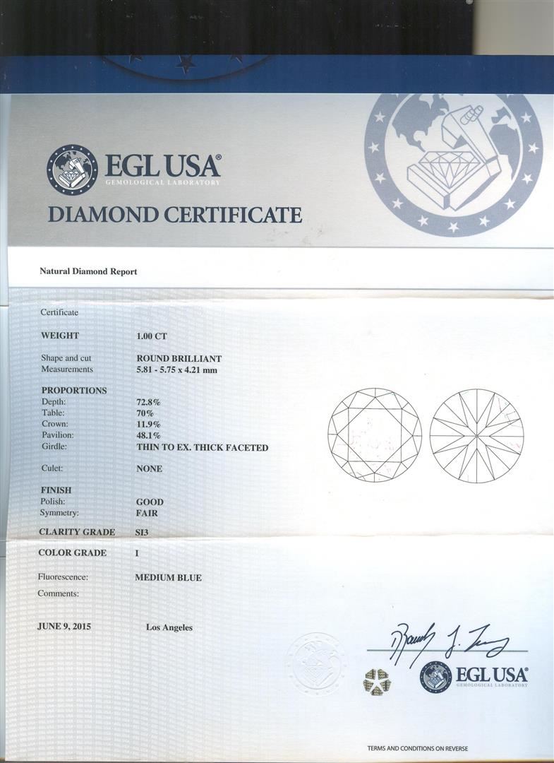 One electronically tested 18KT white gold ladies cast diamond unity ring with a bright polish finish. The featured cathedral set diamond is supported by elaborate diamond set shoulders, completed by a one and one-half millimeter wide band. Trademark is Orianne. Identified with markings of "18K". Condition is new, good workmanship. Containing: One prong set round brilliant cut diamond, measuring 5.81 - 5.75 x 4.21mm exact weight 1.00ct with a medium blue fluorescence. EGL Report attached. Graded loose prior to setting in the EGL Laboratory Report #US 913691412D. Clarity: SI-3. Color: I. Depth 72.8%. Table 70.0%. Pavil. Depth%. 48.1%. Thirty-Four prong & channel set round brilliant & baguette cut diamonds approximate total weight of 34 Stones = 0.67ct. Graded in the setting. Clarity: VS-2 to SI-1. Color: H - J. Total Weight of Diamonds 1.67ct. Total Weight of Ring 4.08gm. AIG Appraised at $8,530.00.
