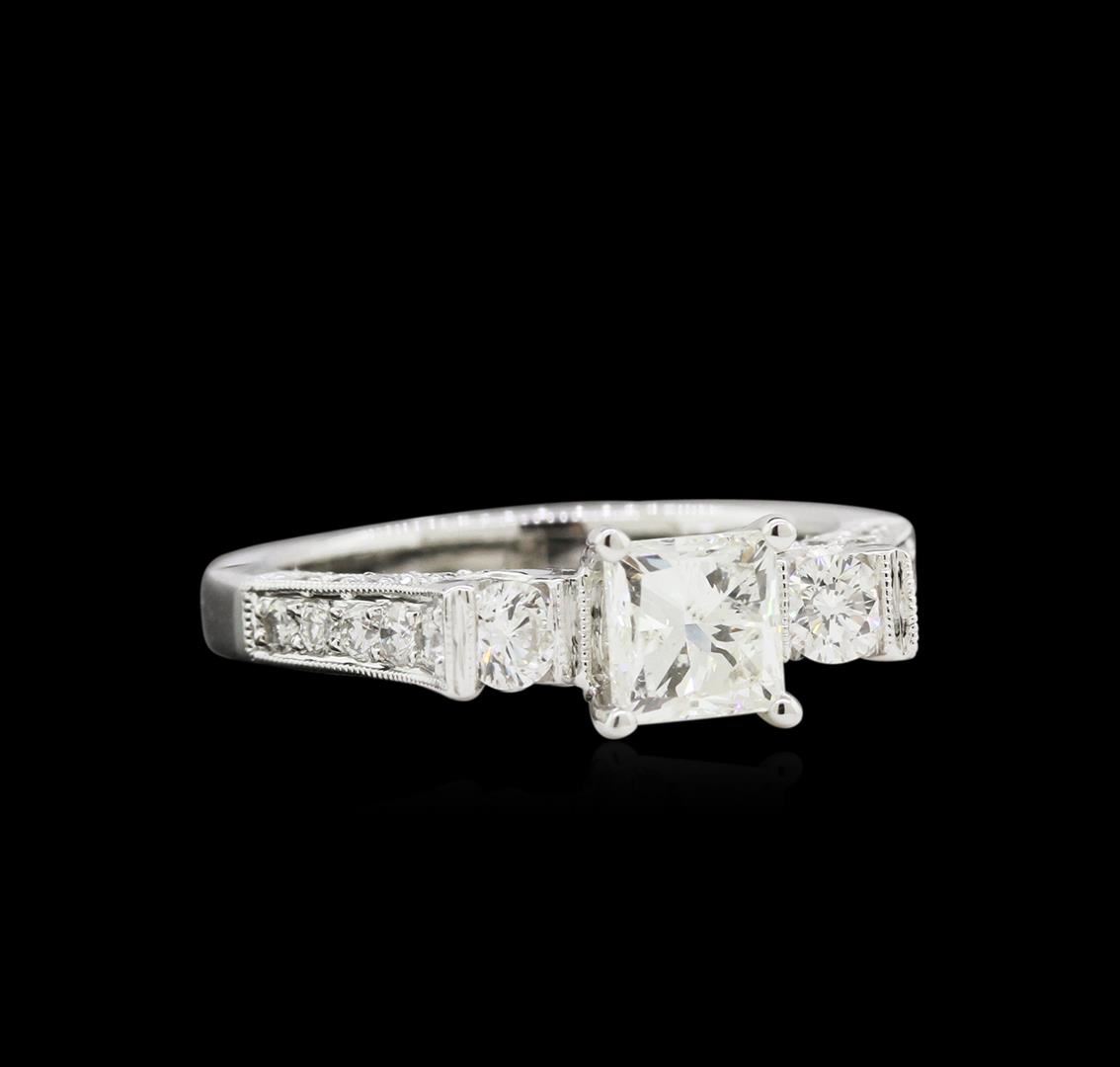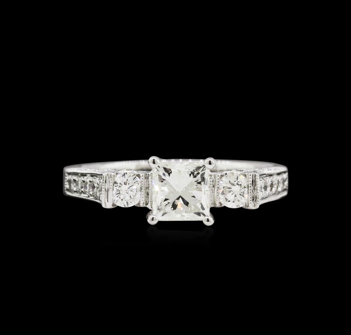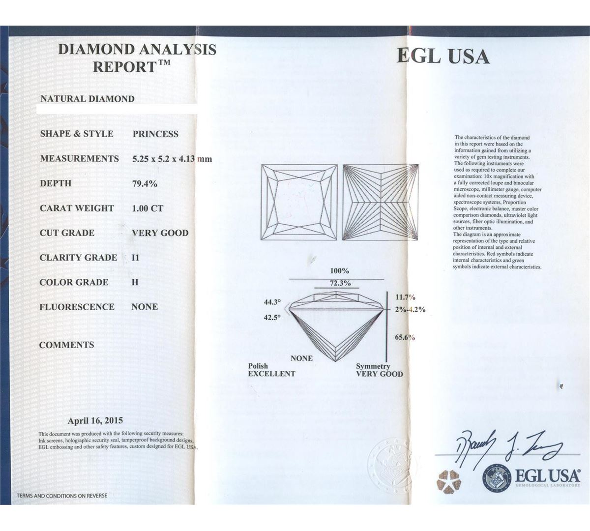 One electronically tested 18KT white gold lady's combination cast & assembled straight line wedding ring with a bright polish with milgrain detailing finish. The featured lady's ring has a shank measuring 2.65 millimeters in width. Identified with markings of "18K". Condition is new, good workmanship. Containing: One prong set princess cut diamond, measuring 5.25 x 5.20 x 4.13mm (depth est.) approximate weight of 1.00ct. EGL USA Laboratory Report #913287402D. Clarity: I-1. Color: Very Good Two channel set round brilliant cut diamonds, measuring 3.19 - 3.14 x 2.00mm (depth est.) approximate total weight of 2 Stones = 0.25ct. Graded in the setting. Clarity: SI-1. Color: Very Good Thirty-Two prong set round brilliant cut diamonds, measuring 1.70 - 1.40 x 0.98mm (depth est.) approximate total weight of 32 Stones = 0.45ct. Graded in the setting. Clarity: VS-2 to SI-1. Color: G - Very Good. Total Weight of Diamonds 1.70ct. Total Weight of Wedding Ring 5.60gm. GAS Appraised at $9,310.00.