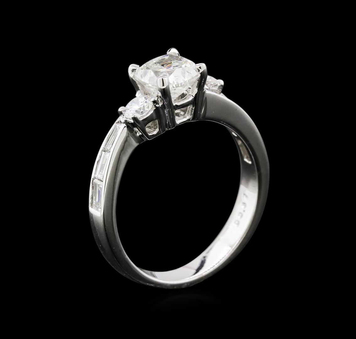 One electronically tested 18KT white gold lady's cast wedding ring with a bypass shank with a bright polish finish. The featured lady's ring has a shank measuring 3.38 millimeters wide. Identified with markings of "18K". Condition is new, good workmanship. Containing: One prong set cushion cut diamond, measuring 5.89 x 5.78 x 4.15mm (depth est.) approximate weight of 1.13ct. EGL USA Laboratory Report #913748408. Clarity: SI-2. Color: Good Two prong set round brilliant cut diamonds, measuring 3.25 - 3.15 x 1.98mm (depth est.) approximate total weight of 2 Stones = 0.26ct. Graded in the setting. Clarity: SI-1. Color: G - Very Good Eight channel set baguette cut diamonds, measuring from 2.65 x 1.25 x 1.06mm (depth est.) to 3.00 x 2.00 x 1.70mm (depth est.) approximate total weight of 8 Stones = 0.35ct. Graded in the setting. Clarity: VS-1 to VS-2. Color: G - Very Good. Total Weight of Diamonds 1.74ct. Total Weight of Ring 4.60gm. GAS Appraised at $14,800.00.