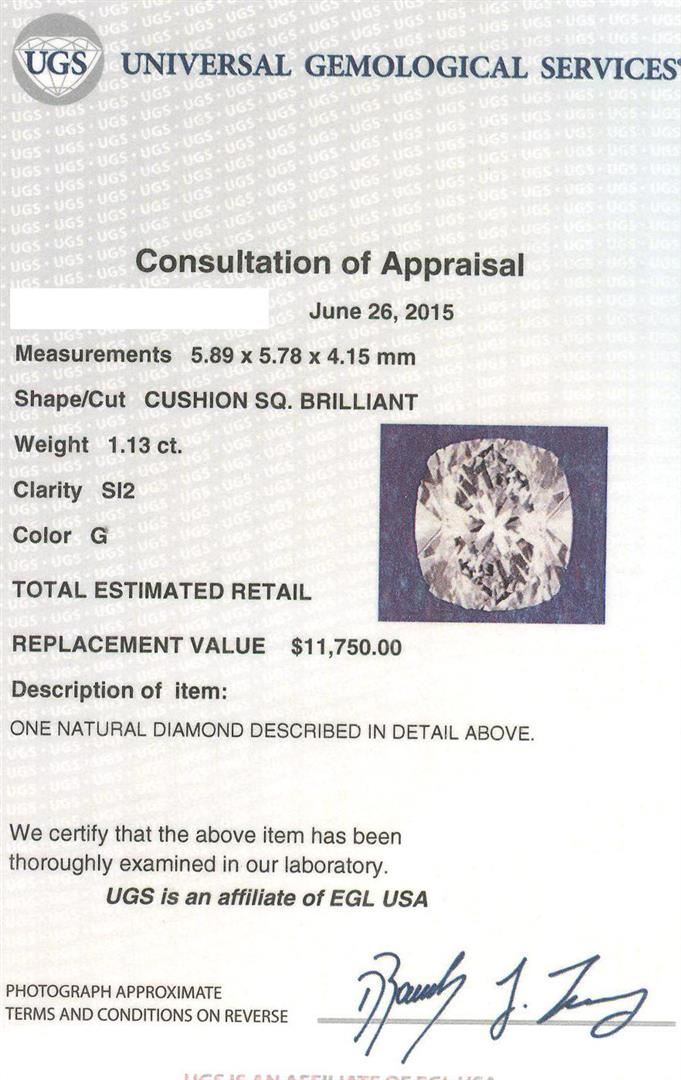 One electronically tested 18KT white gold lady's cast wedding ring with a bypass shank with a bright polish finish. The featured lady's ring has a shank measuring 3.38 millimeters wide. Identified with markings of "18K". Condition is new, good workmanship. Containing: One prong set cushion cut diamond, measuring 5.89 x 5.78 x 4.15mm (depth est.) approximate weight of 1.13ct. EGL USA Laboratory Report #913748408. Clarity: SI-2. Color: Good Two prong set round brilliant cut diamonds, measuring 3.25 - 3.15 x 1.98mm (depth est.) approximate total weight of 2 Stones = 0.26ct. Graded in the setting. Clarity: SI-1. Color: G - Very Good Eight channel set baguette cut diamonds, measuring from 2.65 x 1.25 x 1.06mm (depth est.) to 3.00 x 2.00 x 1.70mm (depth est.) approximate total weight of 8 Stones = 0.35ct. Graded in the setting. Clarity: VS-1 to VS-2. Color: G - Very Good. Total Weight of Diamonds 1.74ct. Total Weight of Ring 4.60gm. GAS Appraised at $14,800.00.
