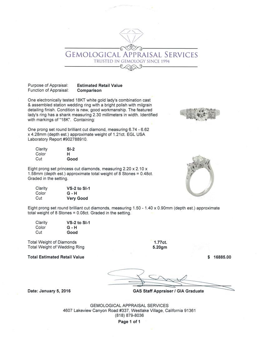 One electronically tested 18KT white gold lady's combination cast & assembled station wedding ring with a bright polish with milgrain detailing finish. The featured lady's ring has a shank measuring 2.30 millimeters in width. Identified with markings of "18K". Condition is new, good workmanship. Containing: One prong set round brilliant cut diamond, measuring 6.74 - 6.62 x 4.28mm (depth est.) approximate weight of 1.21ct. EGL USA Laboratory Report #902788910. Clarity: SI-2. Color: Good Eight prong set princess cut diamonds, measuring 2.20 x 2.10 x 1.58mm (depth est.) approximate total weight of 8 Stones = 0.48ct. Graded in the setting. Clarity: VS-2 to SI-1. Color: G - Very Good Eight prong set round brilliant cut diamonds, measuring 1.50 - 1.40 x 0.90mm (depth est.) approximate total weight of 8 Stones = 0.08ct. Graded in the setting. Clarity: VS-2 to SI-1. Color: G - Good. Total Weight of Diamonds 1.77ct. Total Weight of Wedding Ring 5.20gm. GAS Appraised at $16,885.00.